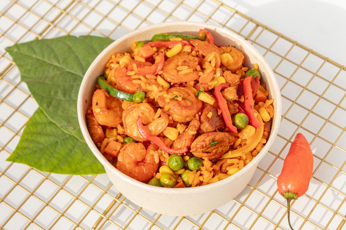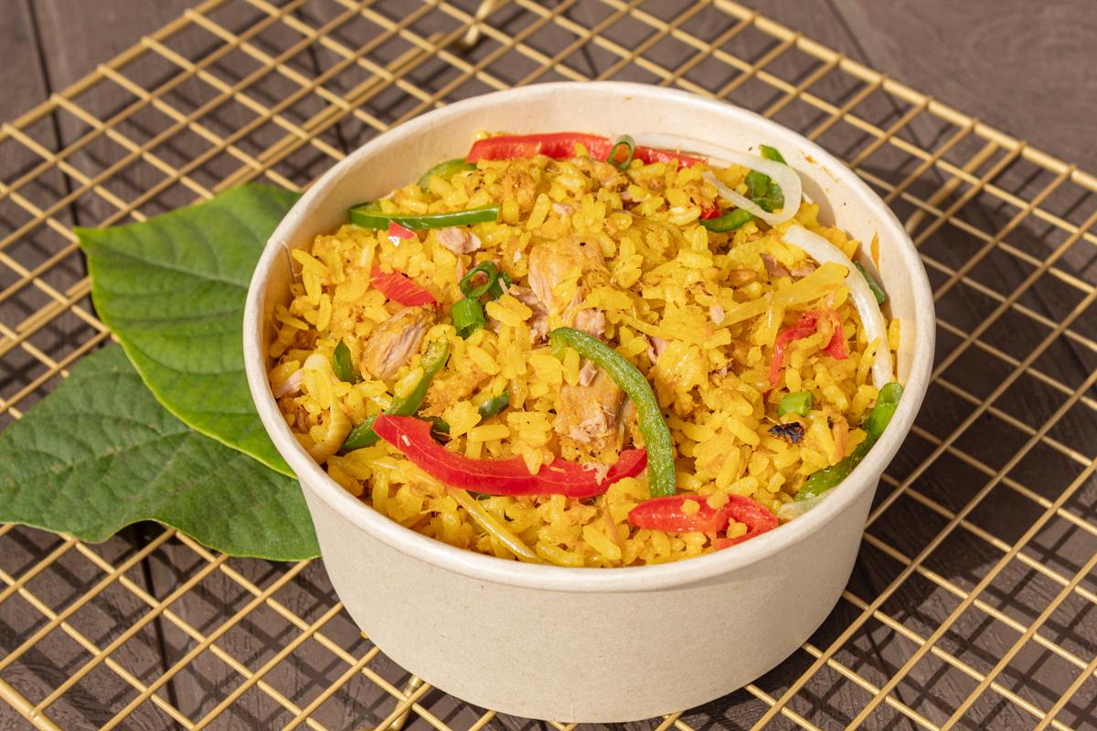 Un arroz con pollo lleno de sabor y tradición, salteado con trozos jugosos de pollo, jamón, vegetales frescos (zanahoria, arvejas, maíz) y un sofrito caribeño con jengibre, ajo, pimentón y cebolla morada. Todo se mezcla con arroz graneado y se termina con fondo de ave y cebollín fresco. ¡Un clásico caribeño lleno de sazón y color!
