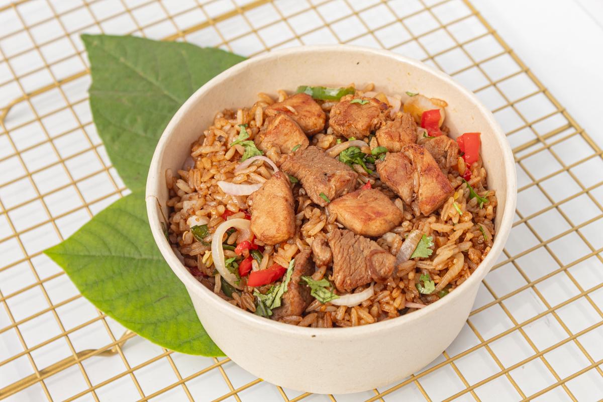 Arroz salteado al wok con pollo y verduras crujientes, salsa de soja y especias orientales, porción 26 oz.