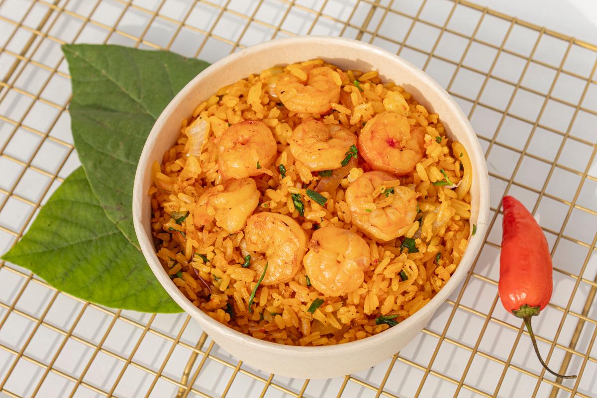 Arroz con camarones frescos, acompañado de un sofrito ligero y especias que realzan su sabor natural, porción 26 oz.