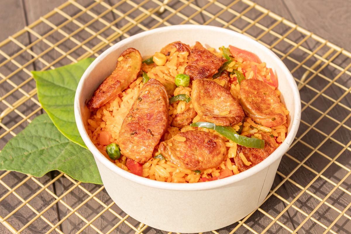Arroz con chorizo troceado, vegetales salteados, creando una mezcla perfecta de aromas y sabor ahumado, porción 26 oz.