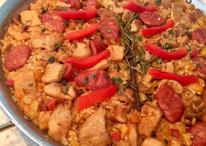 Arroz salteado de 1600 g, con verduras, pollo, cerdo, carne, chorizo artesanal, tajadas de guineo verde