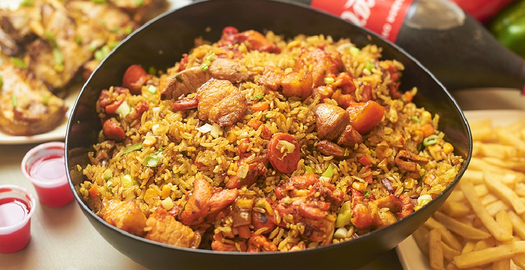 Arroz salteado de 1200 g, con verduras, pollo, cerdo, carne, chorizo artesanal, tajadas de guineo, plátano maduro frito y queso frito.