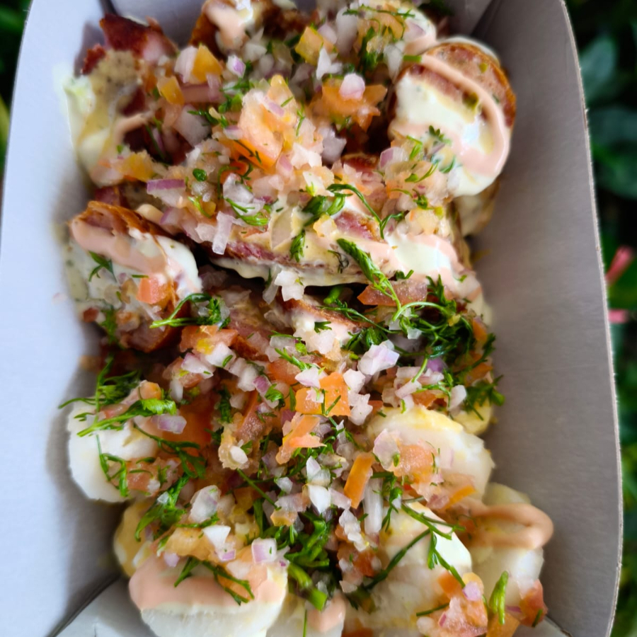 papas criolla con salchicha Ranchera, salsa rosada y salsa tartara.