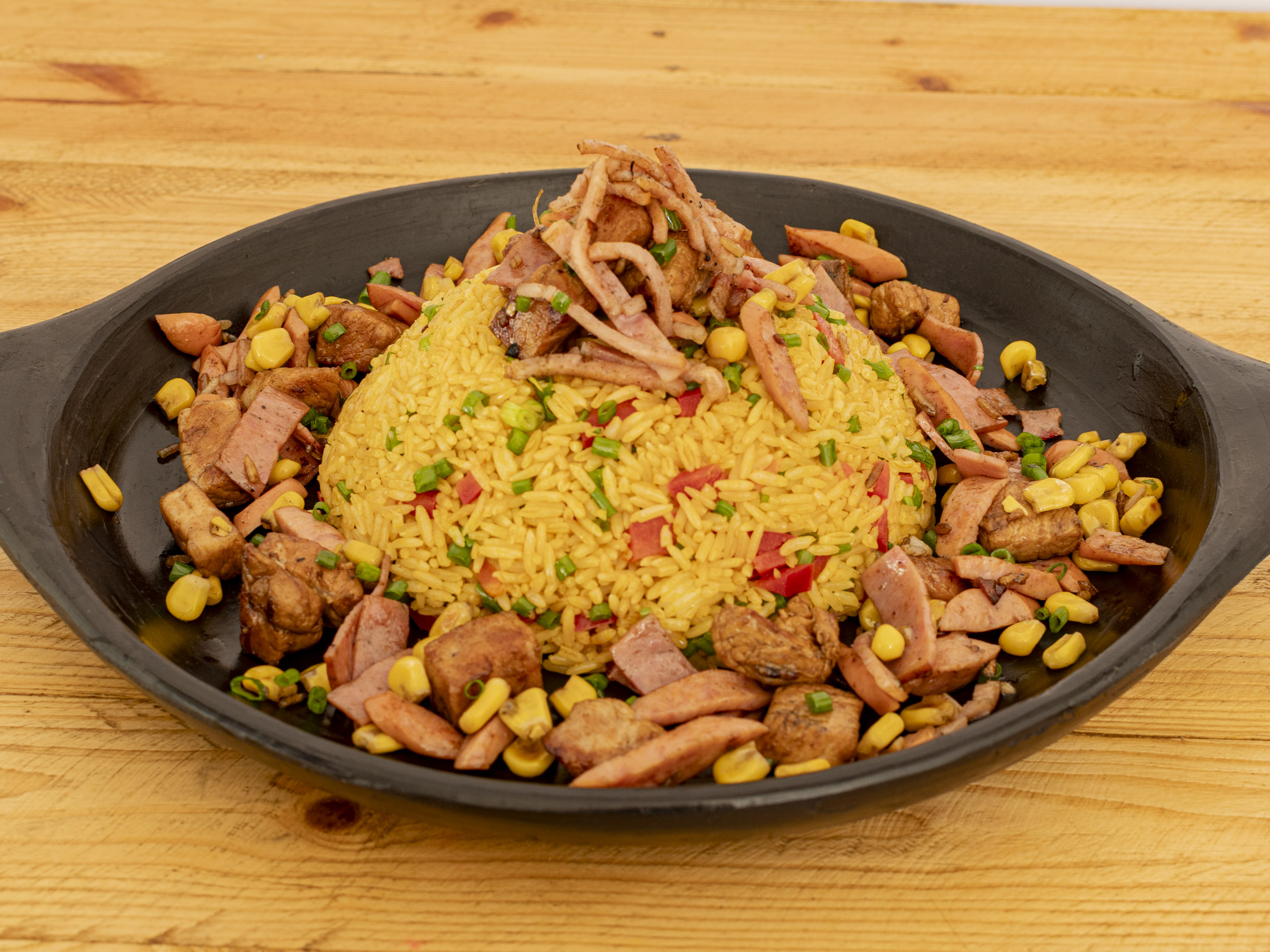 Porción familiar de tipico arroz ranchero con salchicha ranchera, cerdo, tocineta, jamón, raices chinas, cebollín, cebolla, maiz y maduro.
