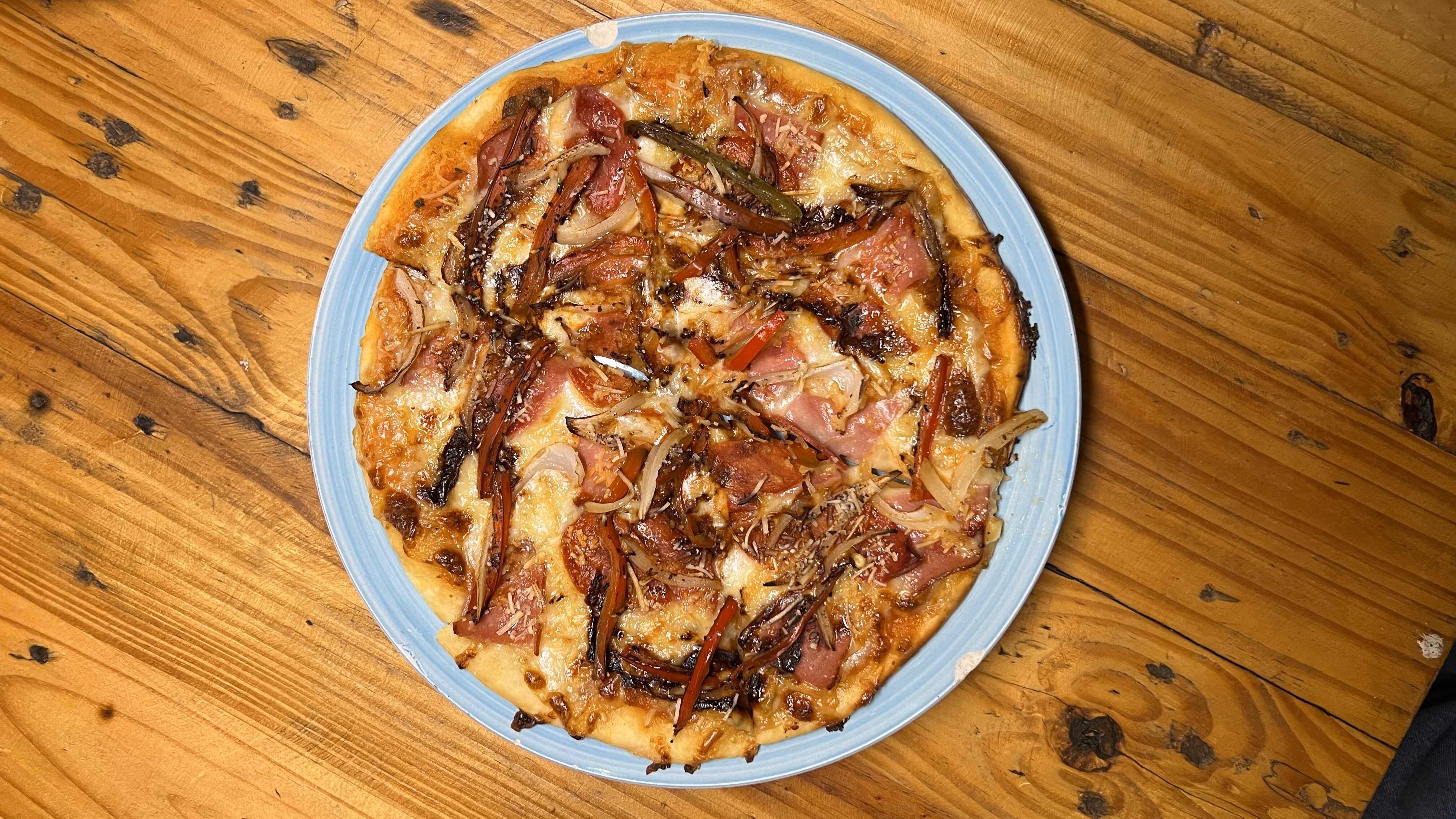 Pizza gourmet con queso Mozarella, salami, jamón, champiñones, pimentón, cebolla, pollo y peperoni