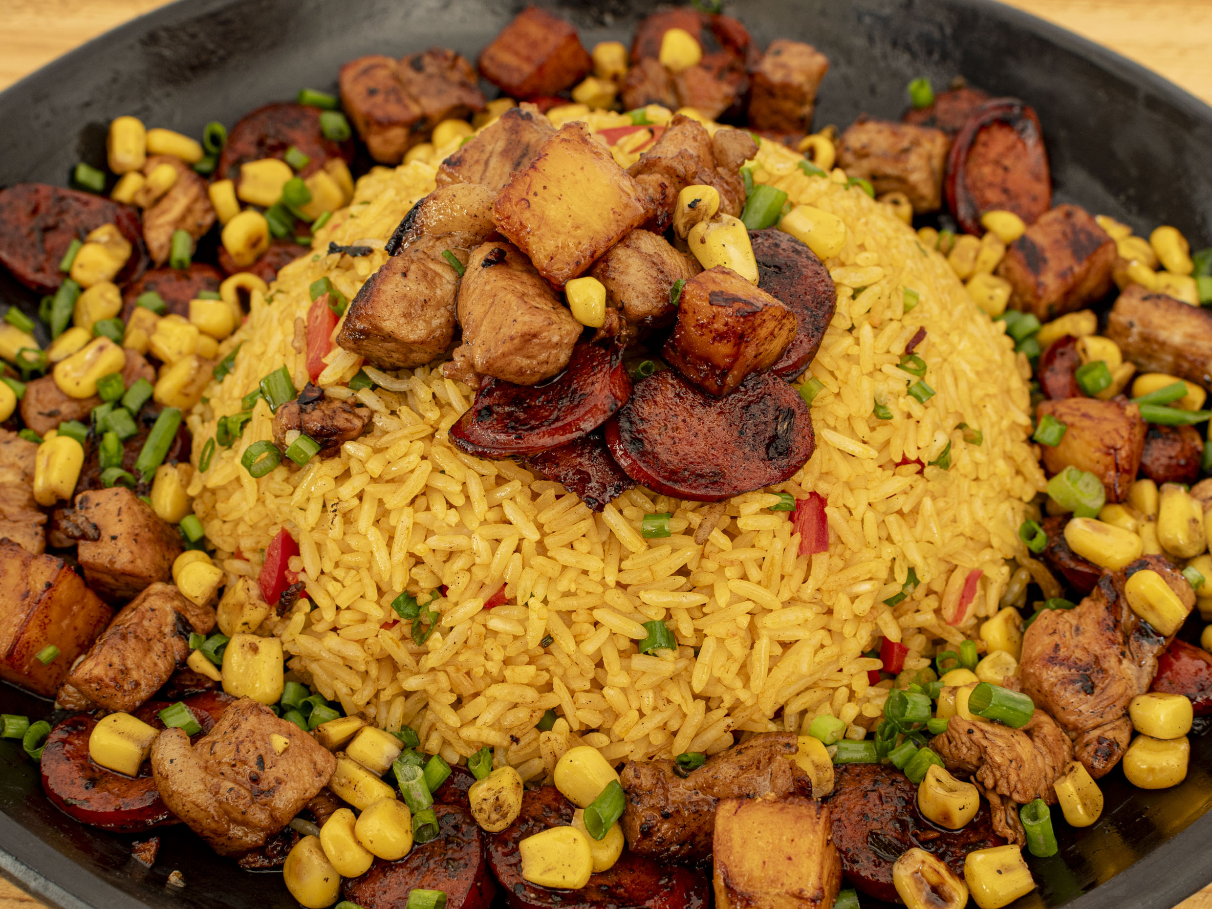 Arroz de tamaño familiar con chorizo, butifarra, jamón, cebolliny queso costeño (frito o asado)