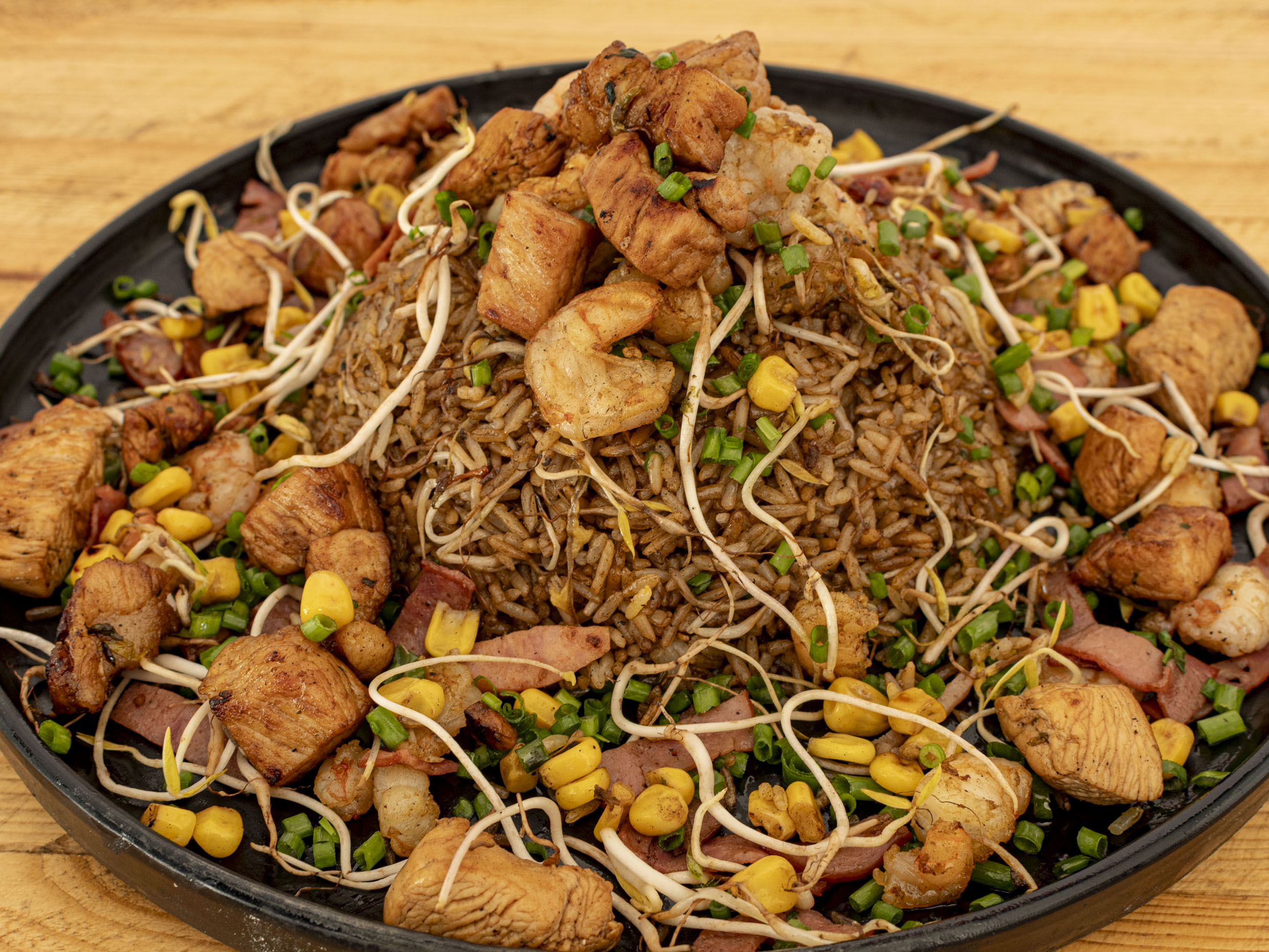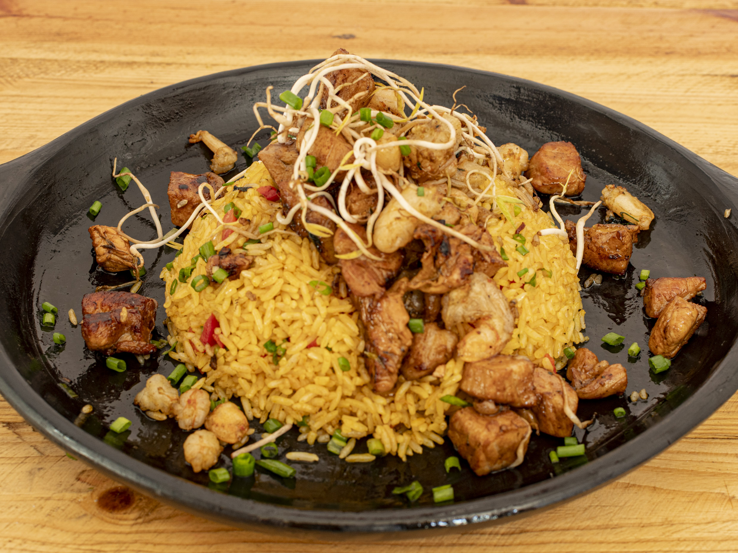 Porción familiar de arroz con pechuga de pollo, camarones, jamón, raices chinas, cebollín y salsa de soya.