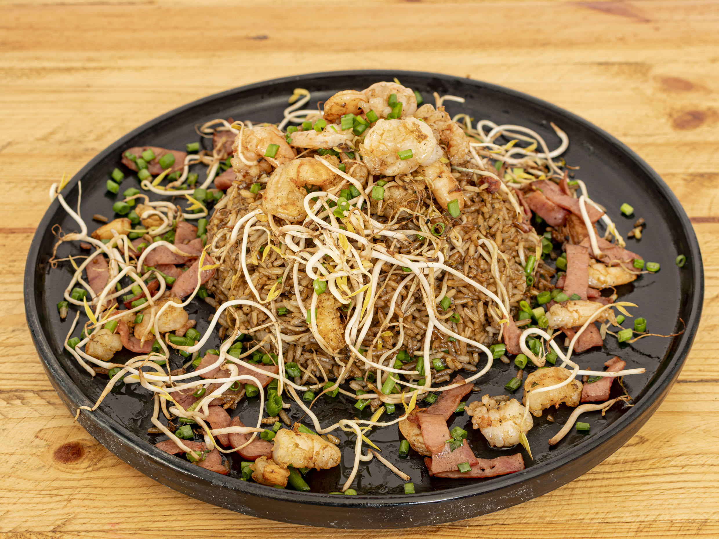 Porción familiar de arroz con cerdo, camarones, jamón, raices chinas, cebollín y salsa de soya.