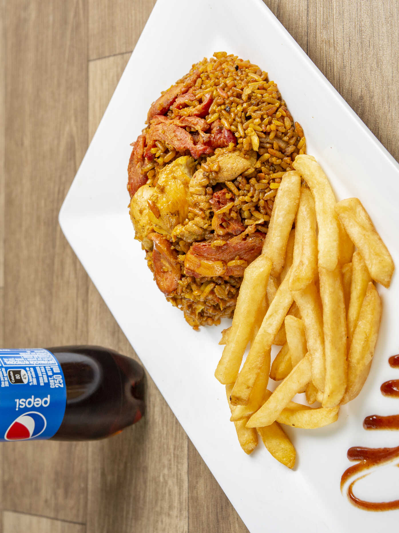 Arroz paisa express (pollo, pernil de cerdo, chicharrón, plátano maduro, maicitos), papa francesa y gaseosa (Colombiana, Pepsi, uva, manzana).