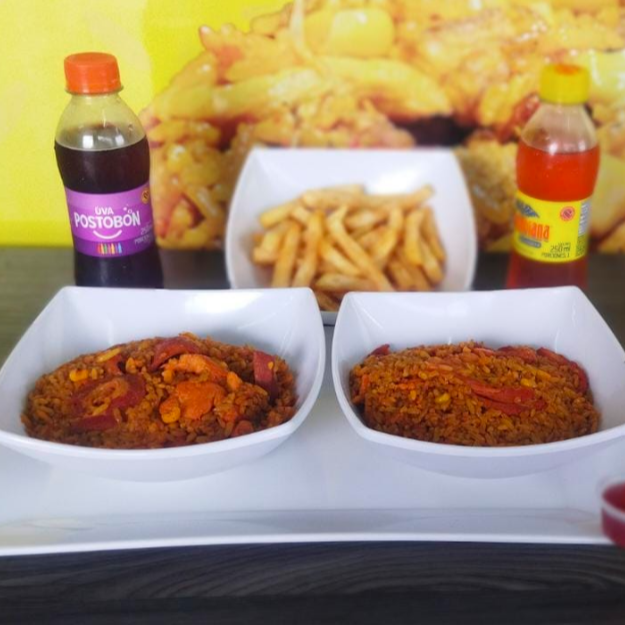 Arroz ranchero express (pollo, pernil de cerdo, costilla ahumada, chorizo de ternera, maicitos), papa francesa y gaseosa (Colombiana, Pepsi, uva, manzana).