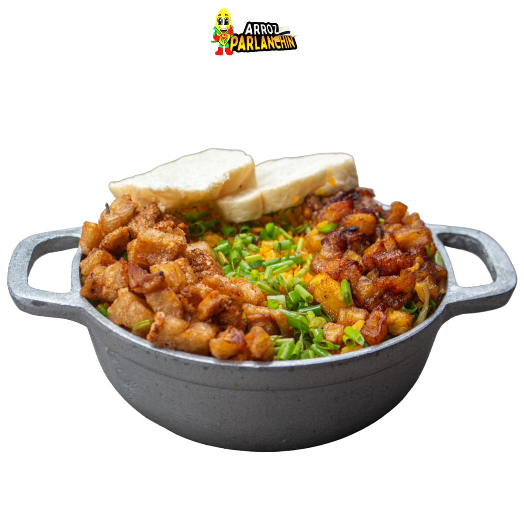 Arroz salteado con queso frito, pollo en trocitos, cerdo en trocitos, chorizo, butifarra, vegetales.