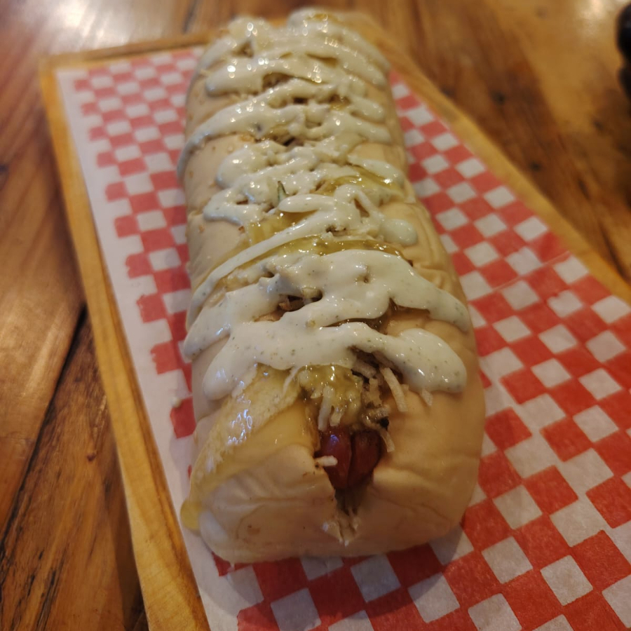 Salchicha premium, pechuga de pollo asada, lechuga, queso costeño bajo en sal, papa chongo, salsa de la casa, salsa dijonesa, salsa de piña artesanal, queso mozzarella fundido y pan artesanal.
