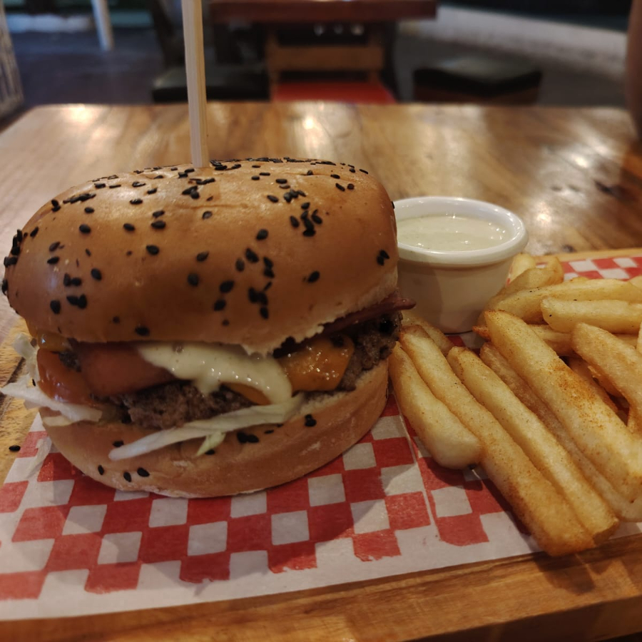 125 g De carne 100% angus, queso cheddar, vegetales frescos, salsa de la casa y salsa dijonesa y jamón ahumado.
