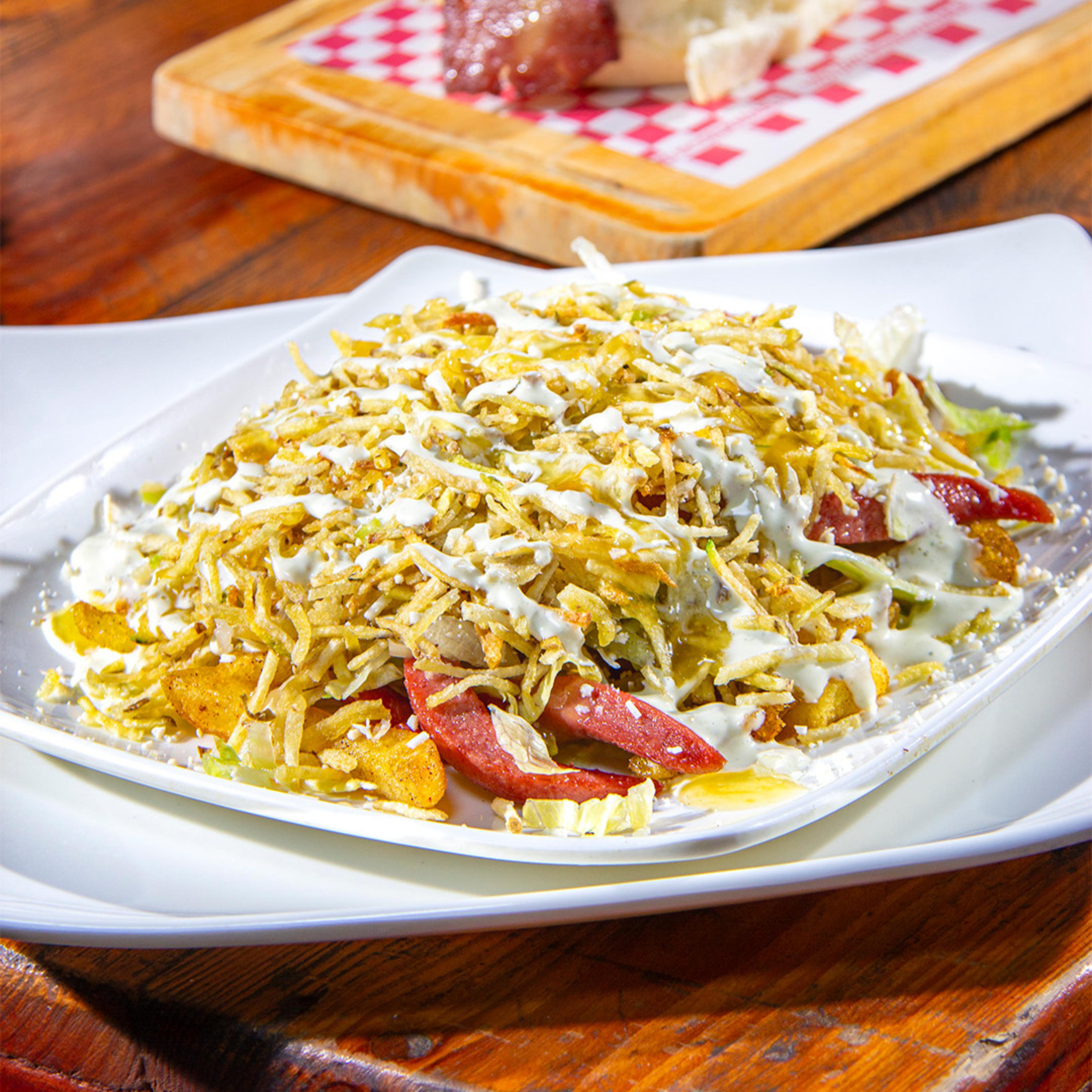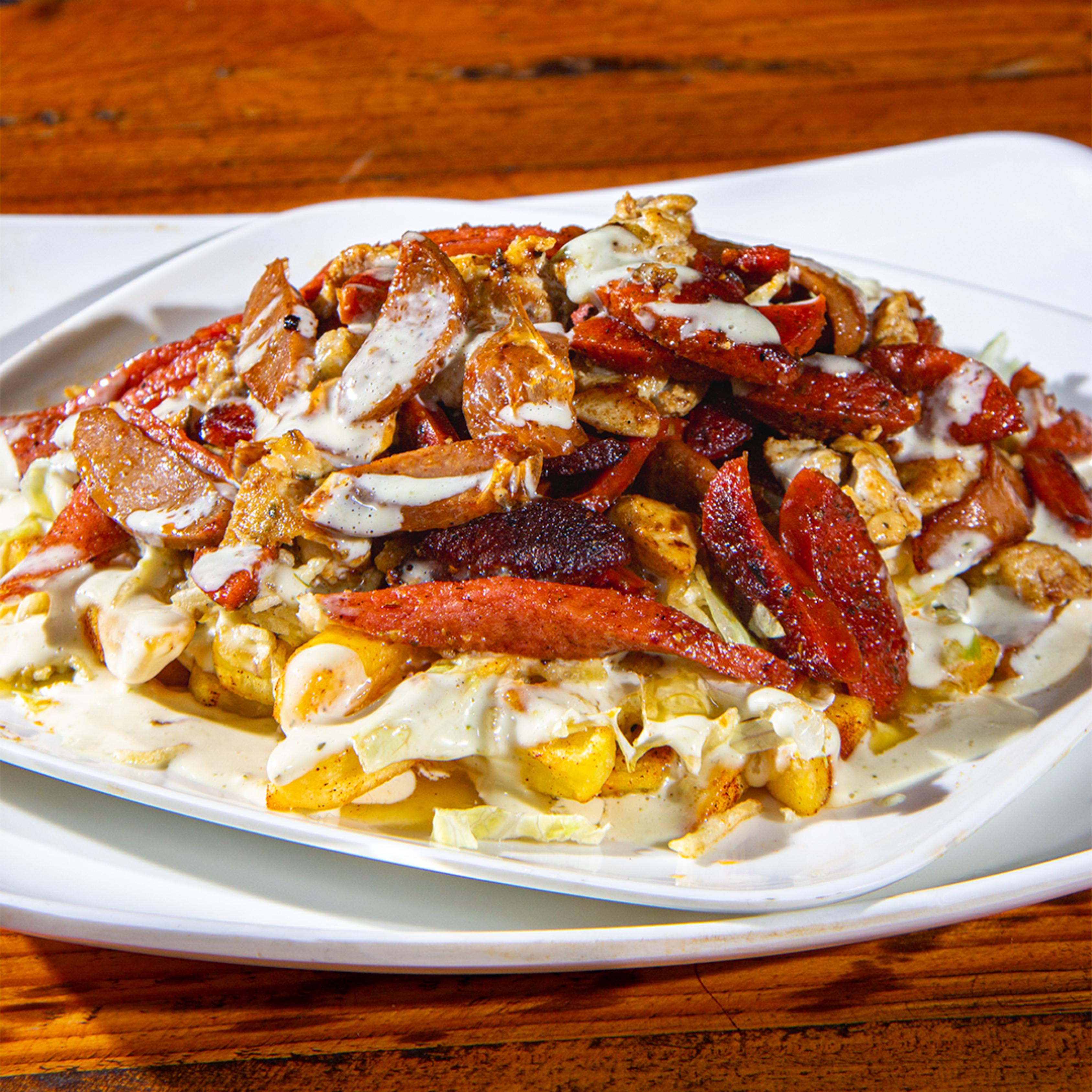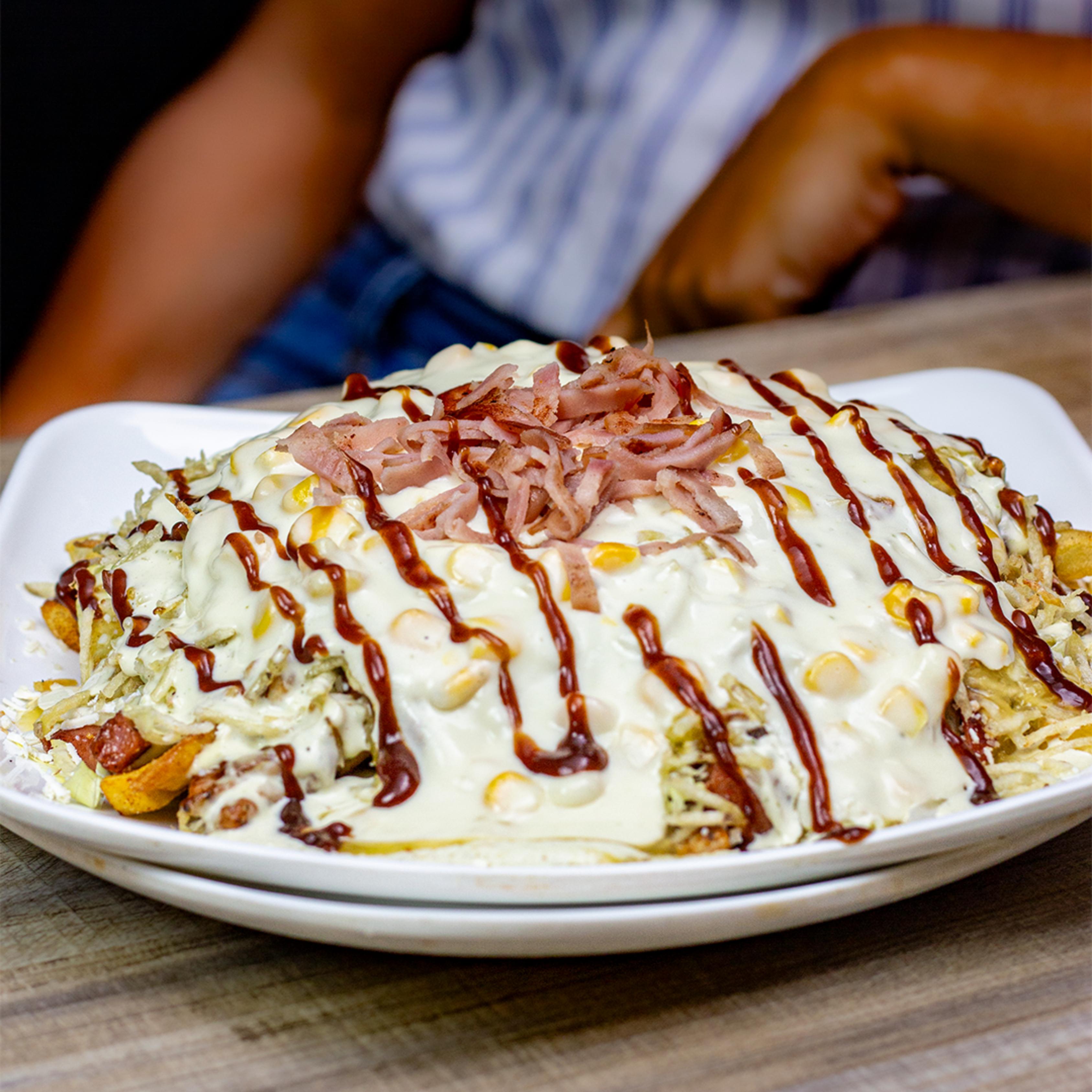 Papas a la francesa adobadas, salchicha premium, chorizo, lechuga, butifarra, pechuga de pollo, cerdo BBQ, queso bajo en sal, papa chongo, bañada en la nueva salsa mayotrufata con gratinado especial de la casa y coronada con jugosas costillas de cerdo BBQ.