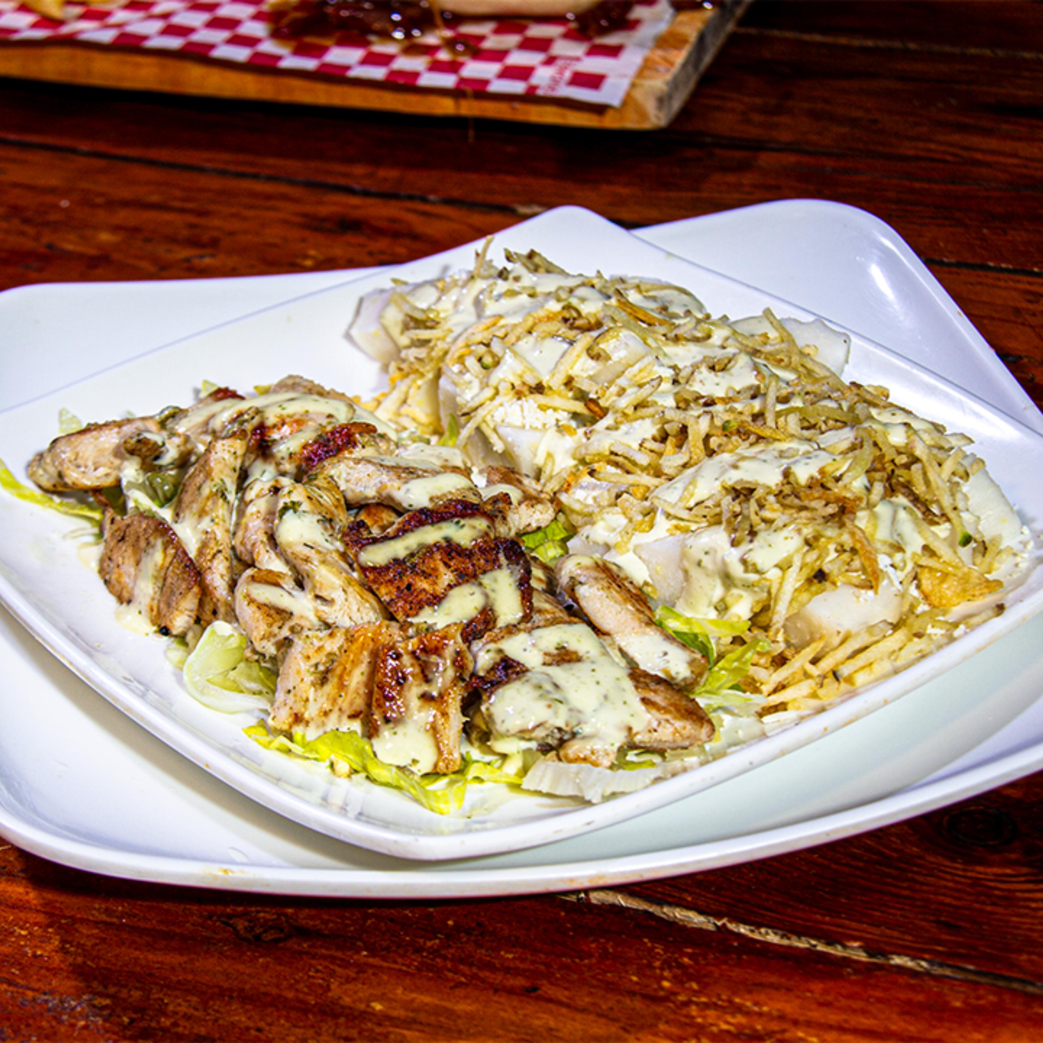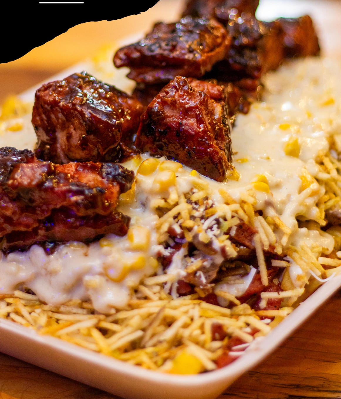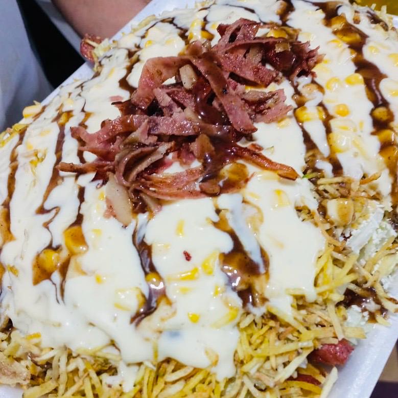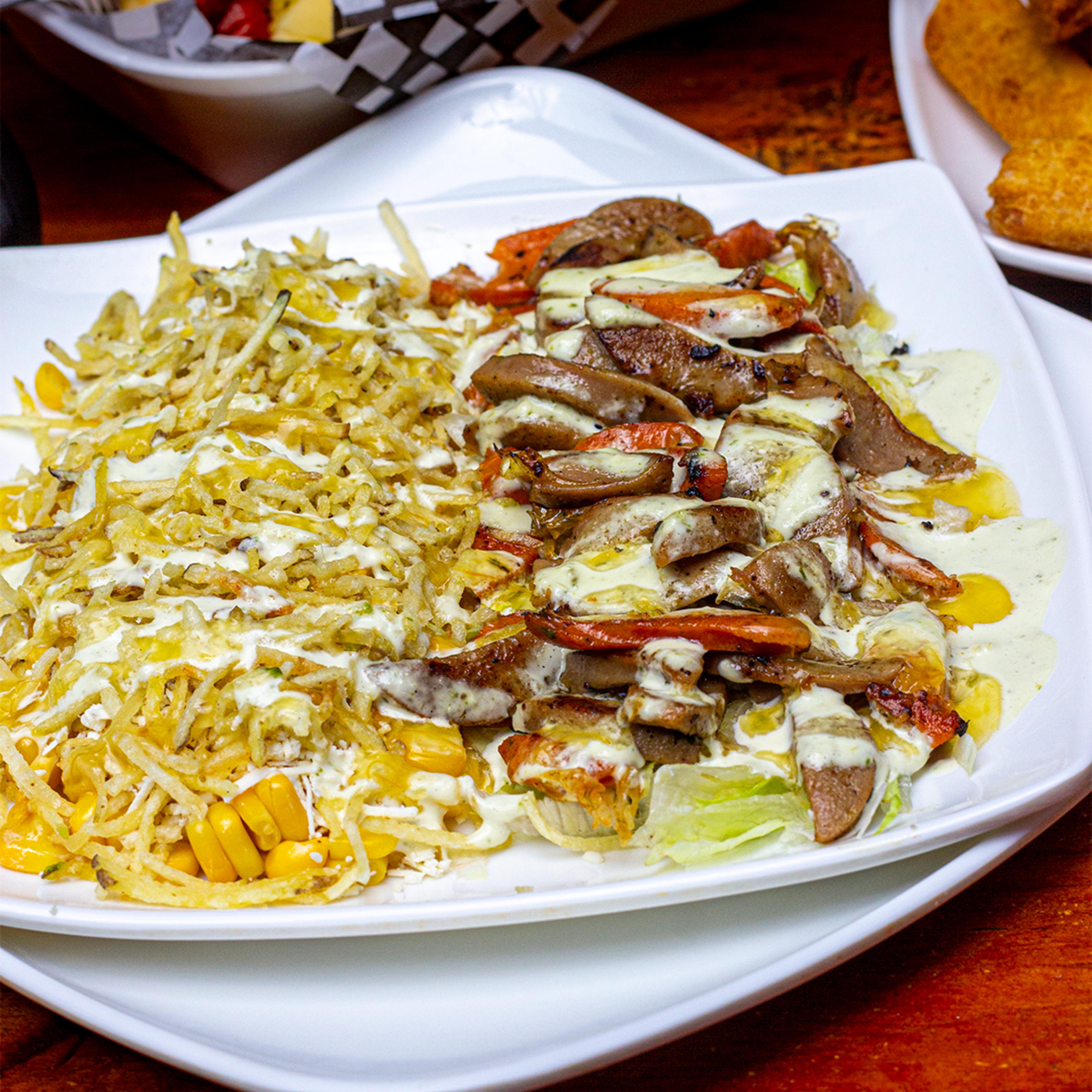 Papas a la francesa adobadas, salchicha premium, chorizo, lechuga, butifarra, pechuga de pollo, cerdo BBQ, queso bajo en sal, papa chongo, bañada en la nueva salsa mayotrufata con gratinado especial de la casa y coronada con jugosas costillas de cerdo BBQ.