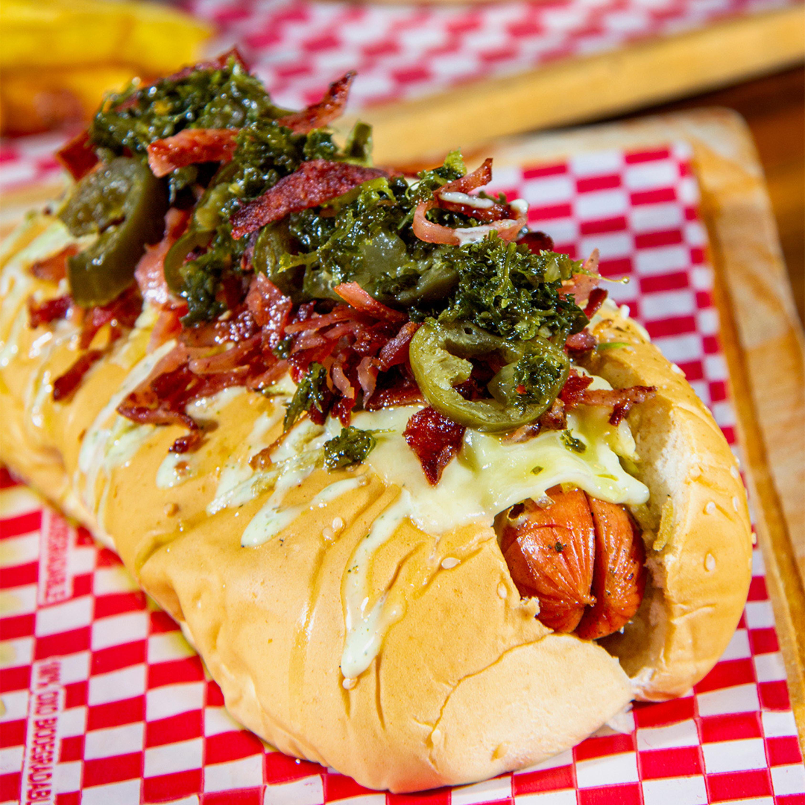 Salchicha premium, lechuga fresca, papa chongo, queso costeño, jalapeños, chimichurri, tocineta, salsa de la casa, jamón ahumado y pan artesanal.