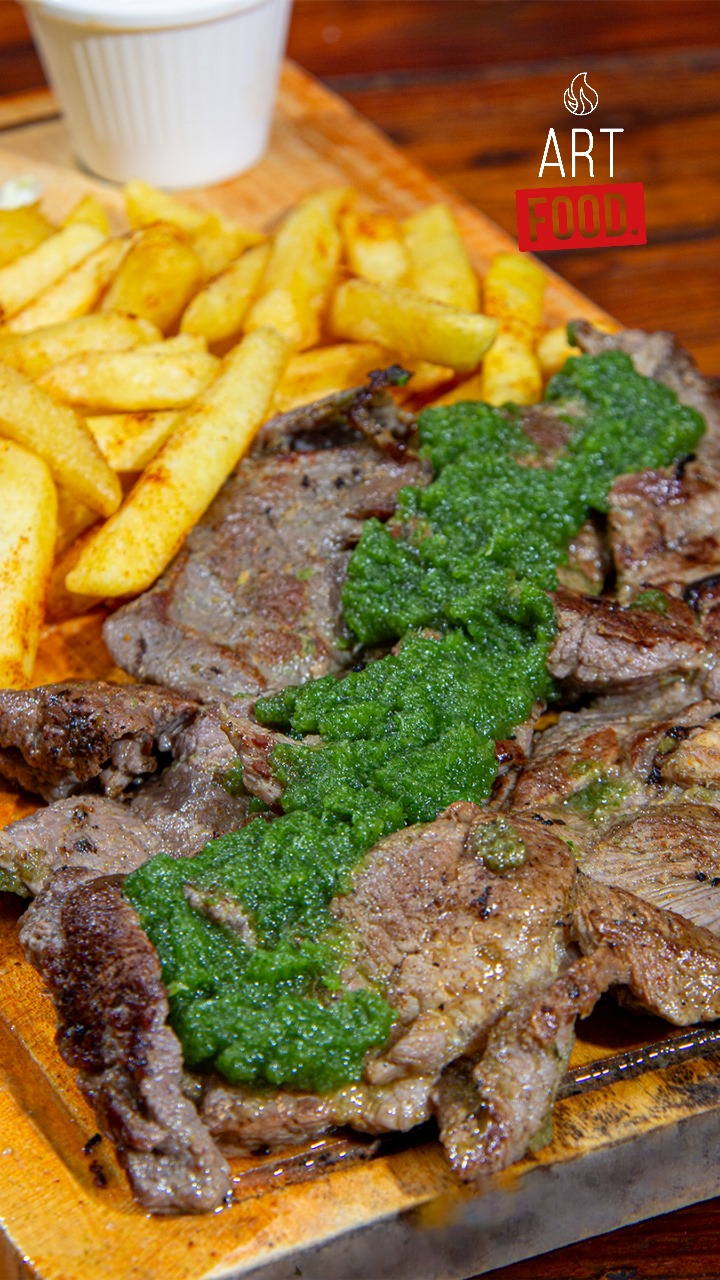 Corte de res seleccionado, bañado en chimichurri de la casa, acompañado de papas a la francesa o croquetas de yuca y ensalada.