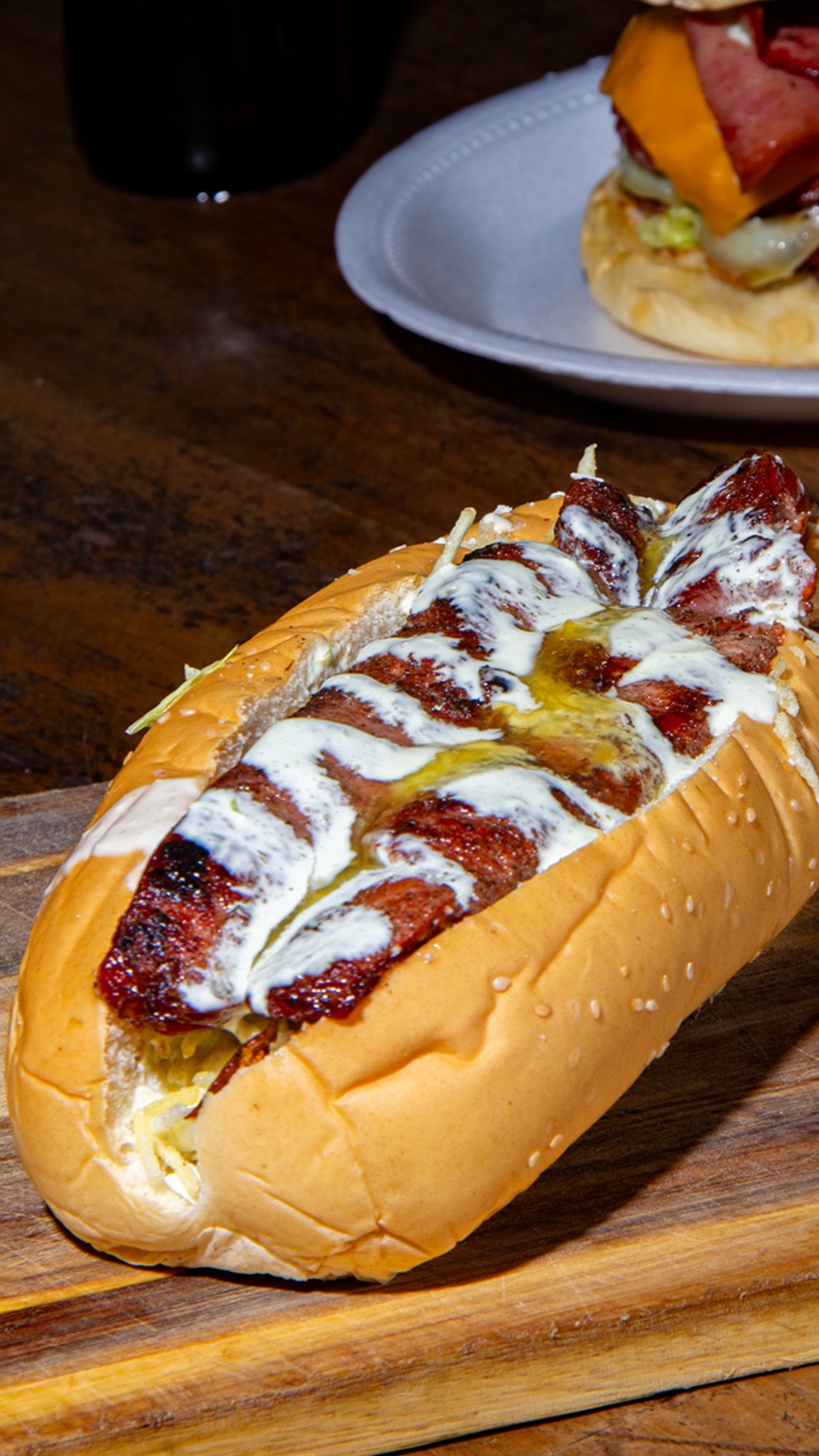 Chorizo artesanal de cerdo seleccionado, acompañado de bollo limpio fresco, nuestra salsa BBQ artesanal y limón.
