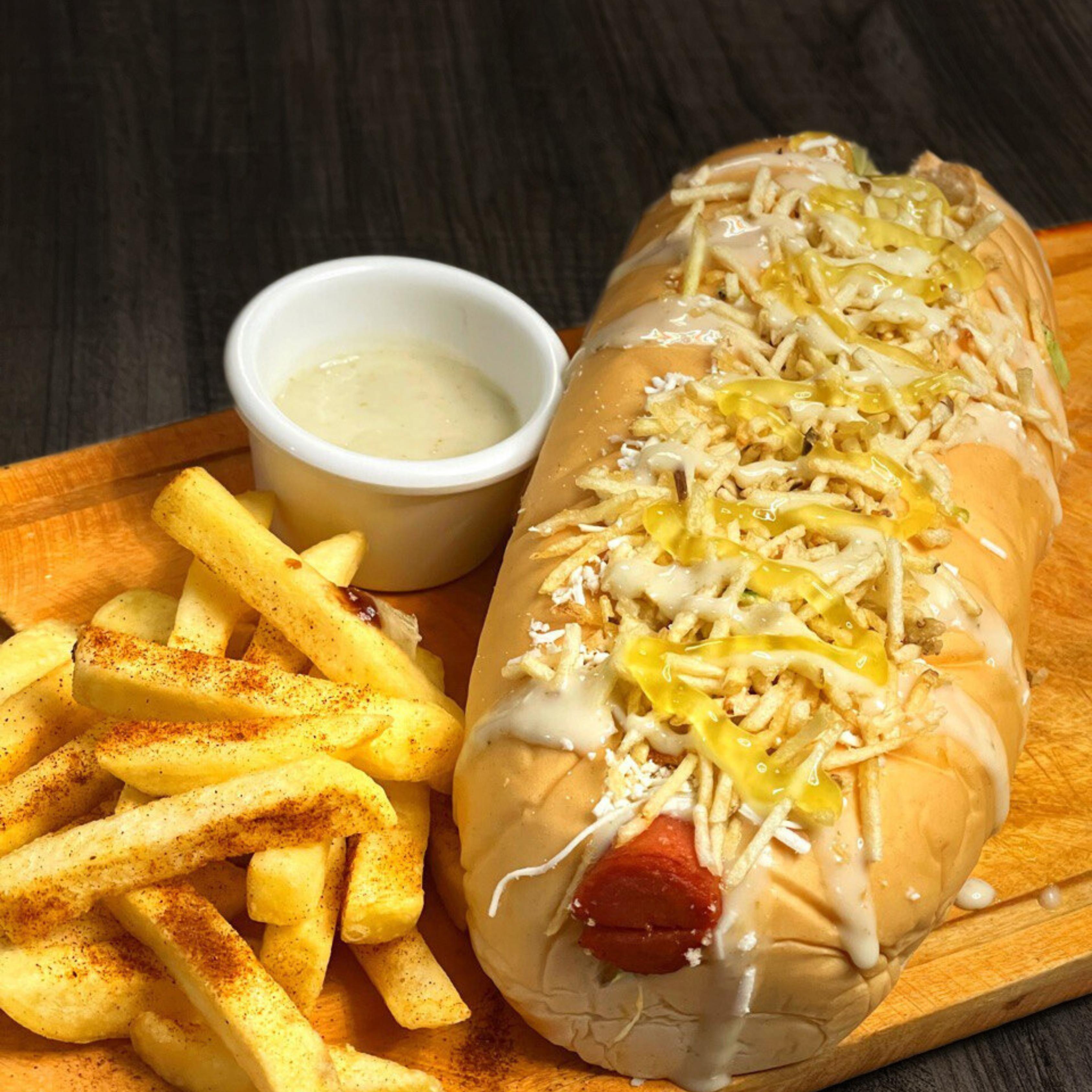 Papas a la francesa especiales, lechuga, salchicha suiza premium, queso bajo en sal, papa chongo, salsa de la casa y salsa artesanal de piña.