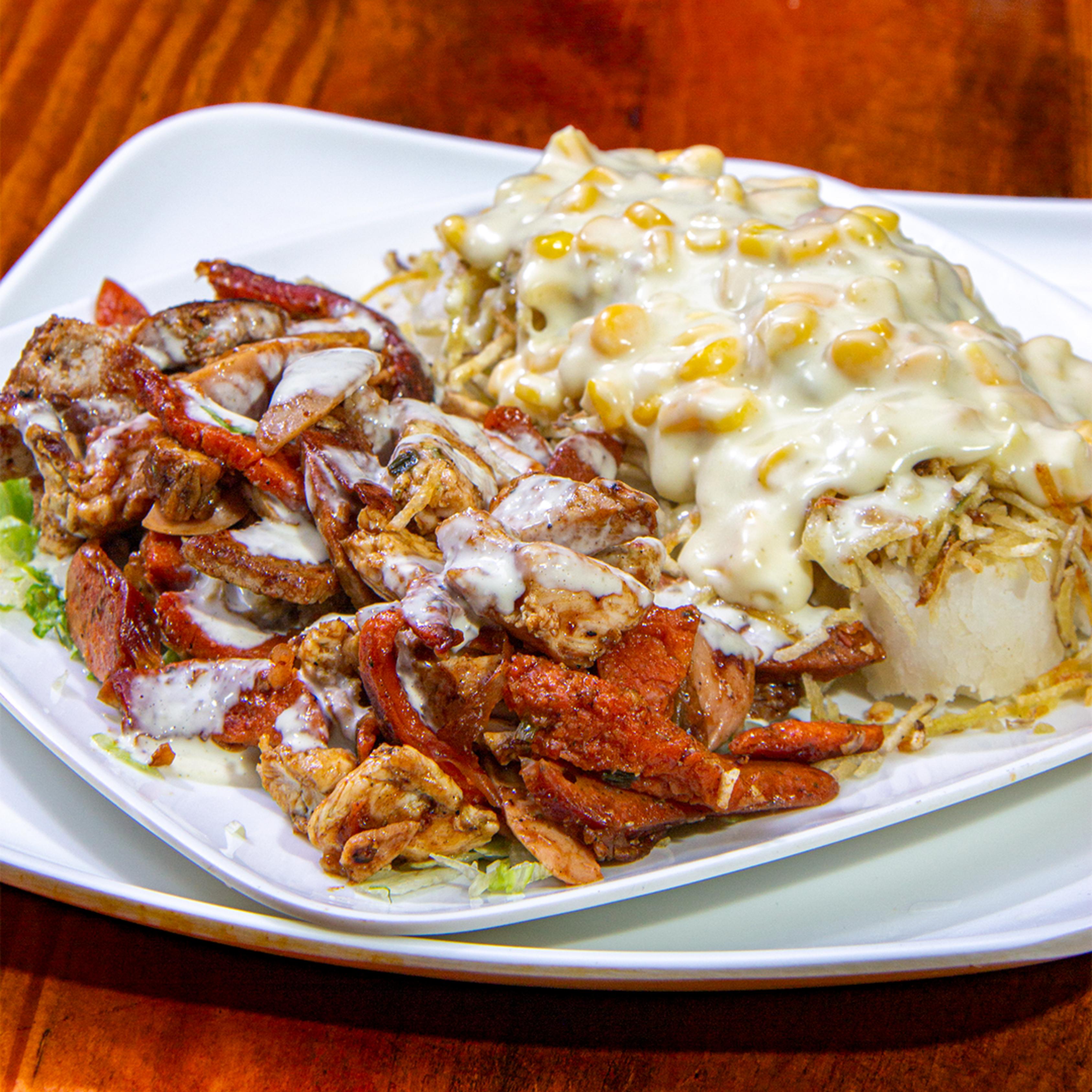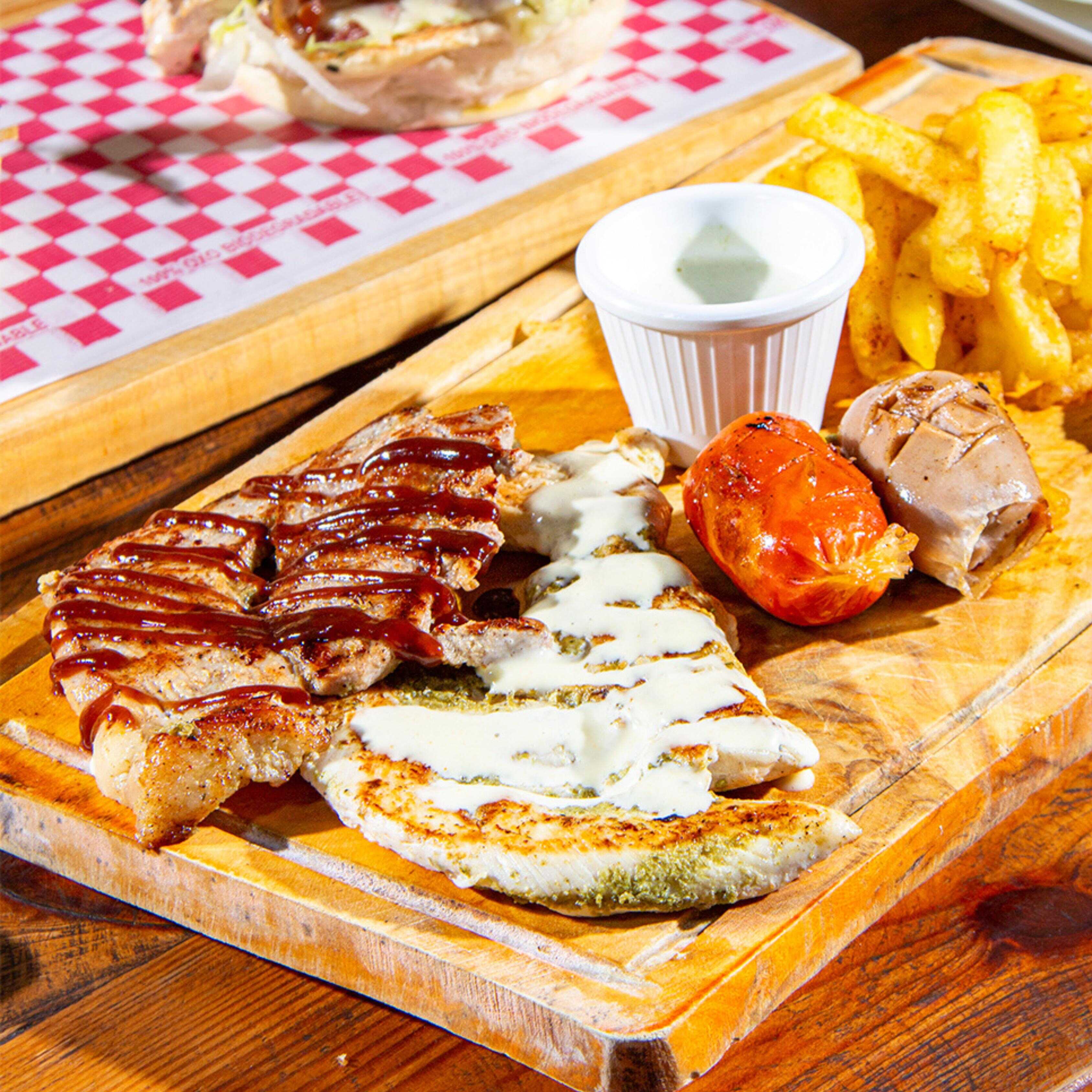 Cerdo en salsa BBQ artesanal, pechuga de pollo bañada en nuestra salsa premium, chorizo y butifarra seleccionados, acompañados de papas a la francesa o croquetas de yuca.