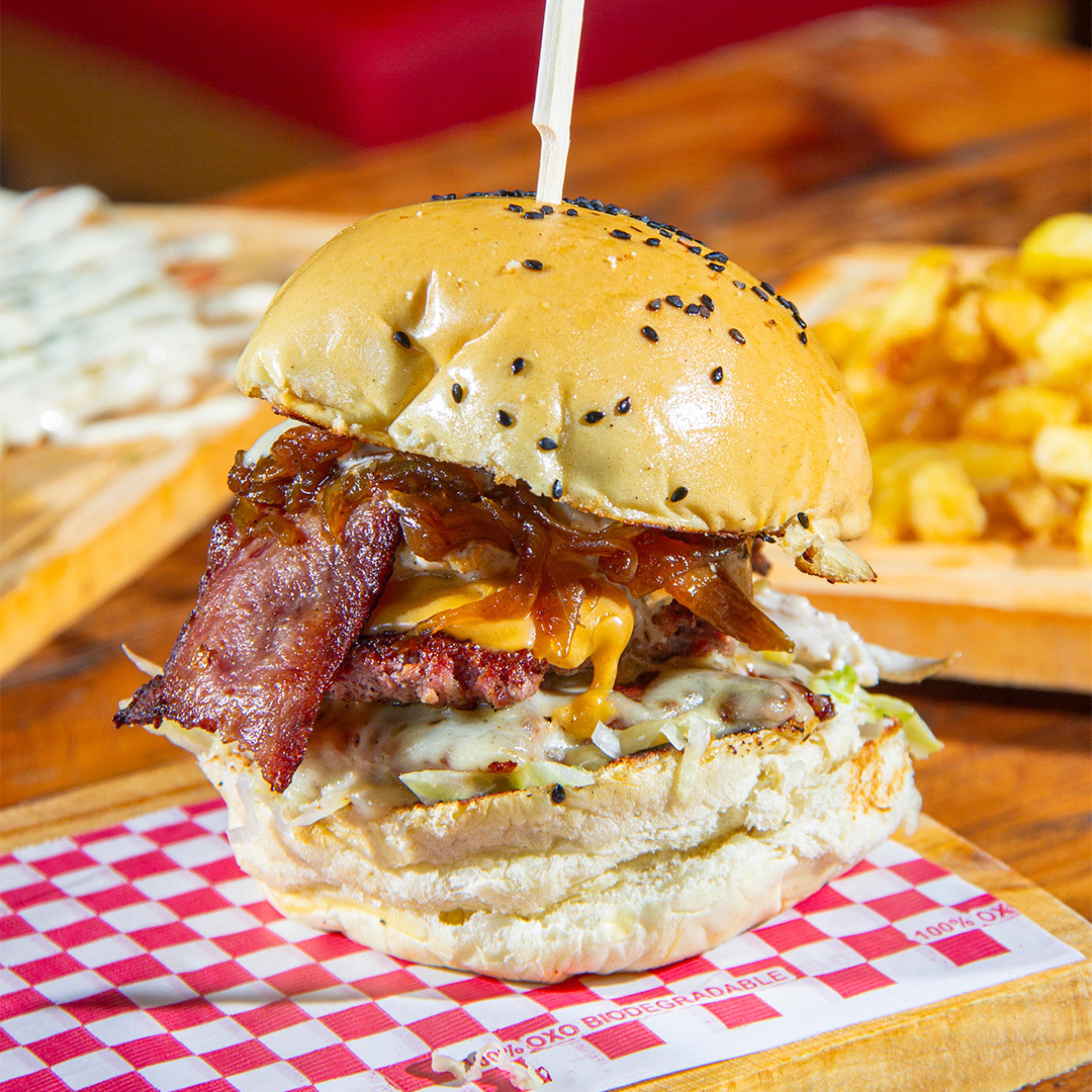 125 g De carne 100% angus, tocineta premium, cebolla caramelizada, queso cheddar y salsa mayosiracha.