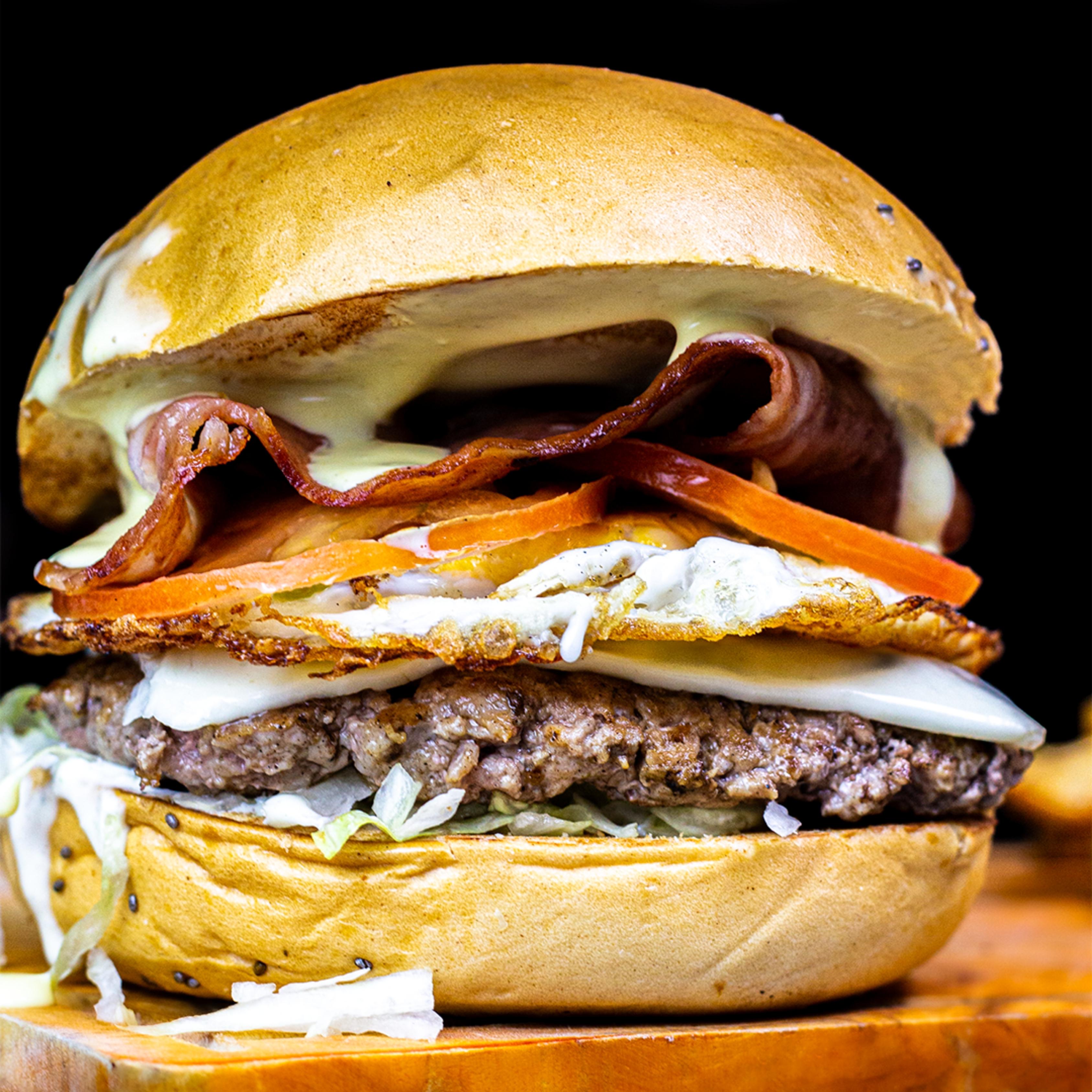 125 g De carne 100% angus, huevo frito, tocineta premium, queso cheddar, vegetales frescos, salsa de la casa y salsa dijonesa, en pan brioche.