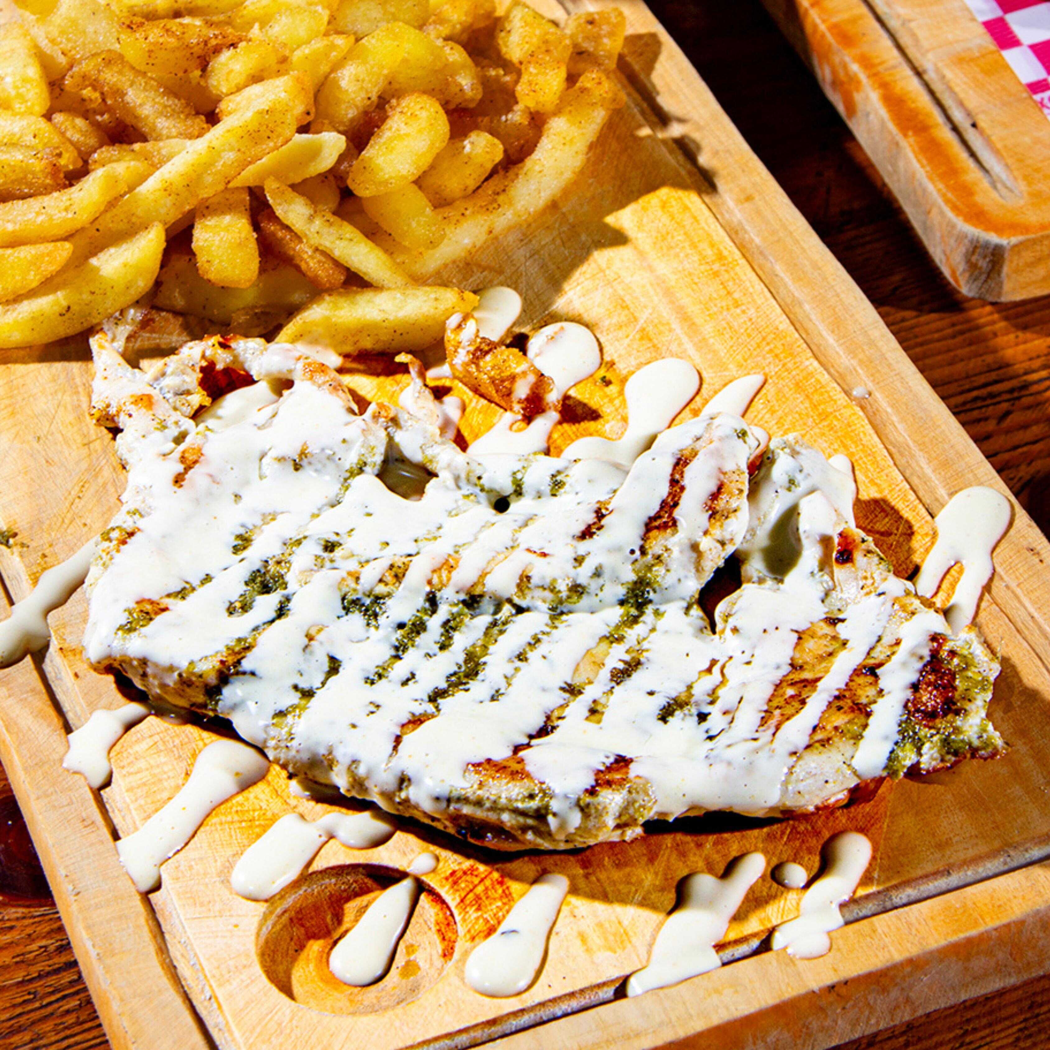200 g De pechuga de pollo con nuestra salsa premium, acompañado de papas a la francesa o croquetas de yuca.