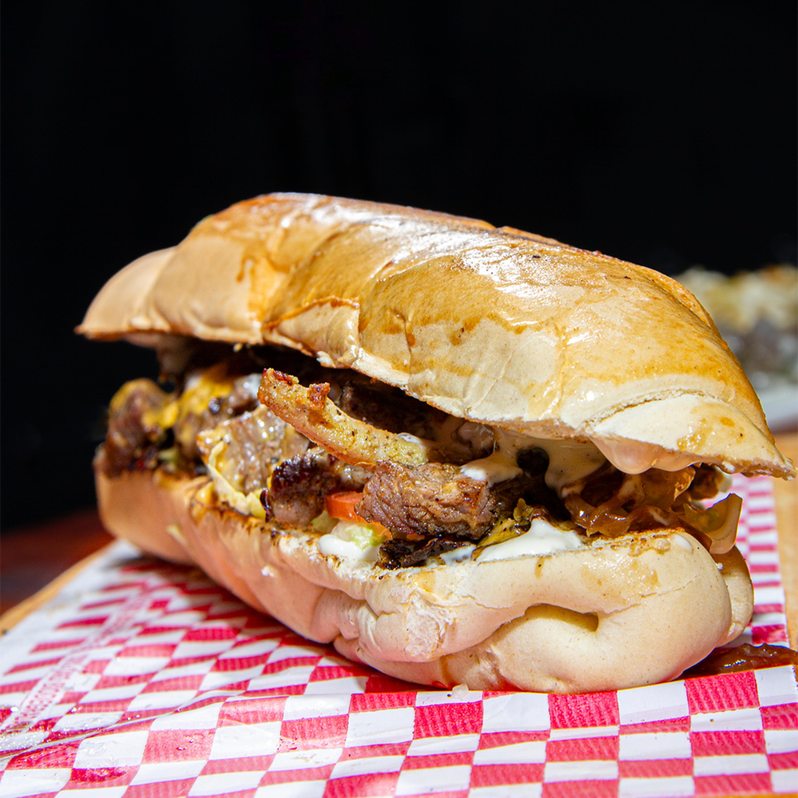 Pan francés, corte de res seleccionado, bañado en chimichurri de la casa, queso cheddar, cebolla caramelizada, lechuga, tomate y salsa de la casa.