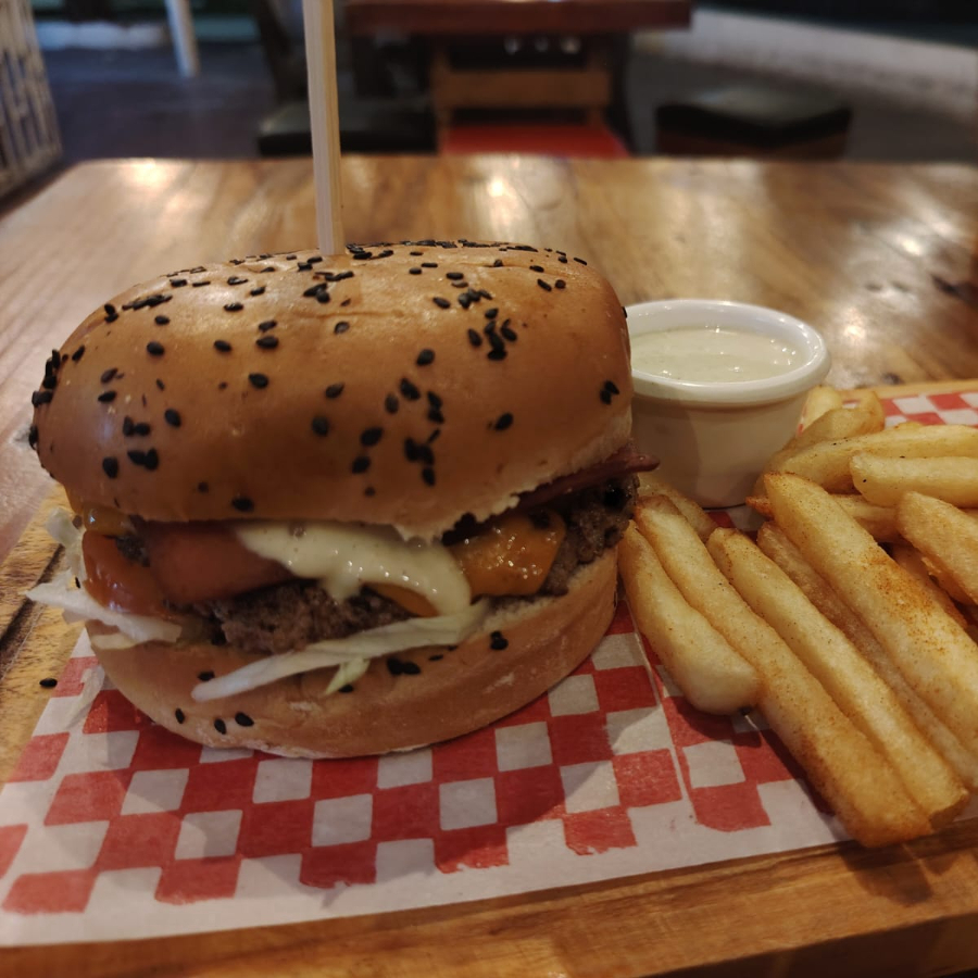 125 g De carne 100% angus, queso cheddar, vegetales frescos, salsa de la casa y salsa dijonesa y jamón ahumado.