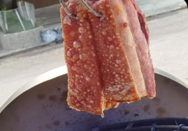 Delicioso chicharrón de cerdo hecho al barril, acompañado de chorizo, bollo y yuca.