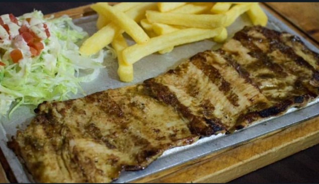 Delicioso asado de pechuga hecha al barril, acompañada de ensalada fresca de lechuga, tomate, cebolla, vinagreta especial y bollo limpio.