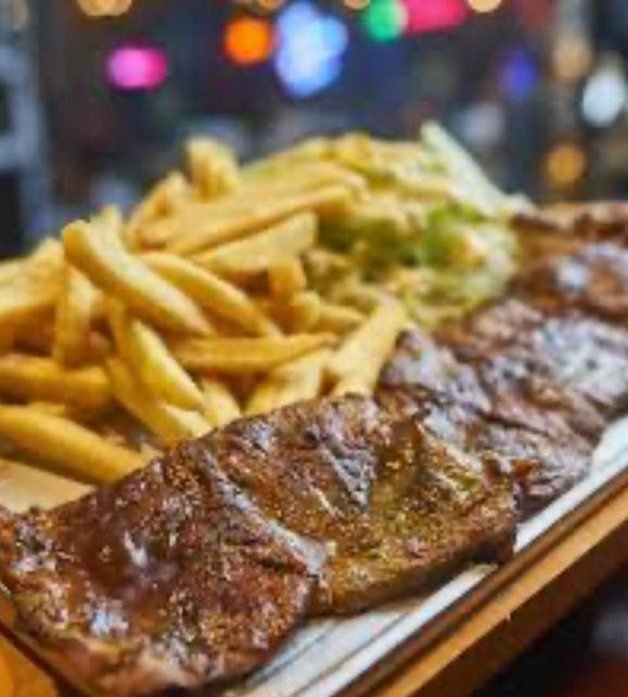 Delicioso asado de carne hecha al barril, acompañada de ensalada fresca de lechuga, tomate, cebolla, vinagreta especial y bollo limpio.