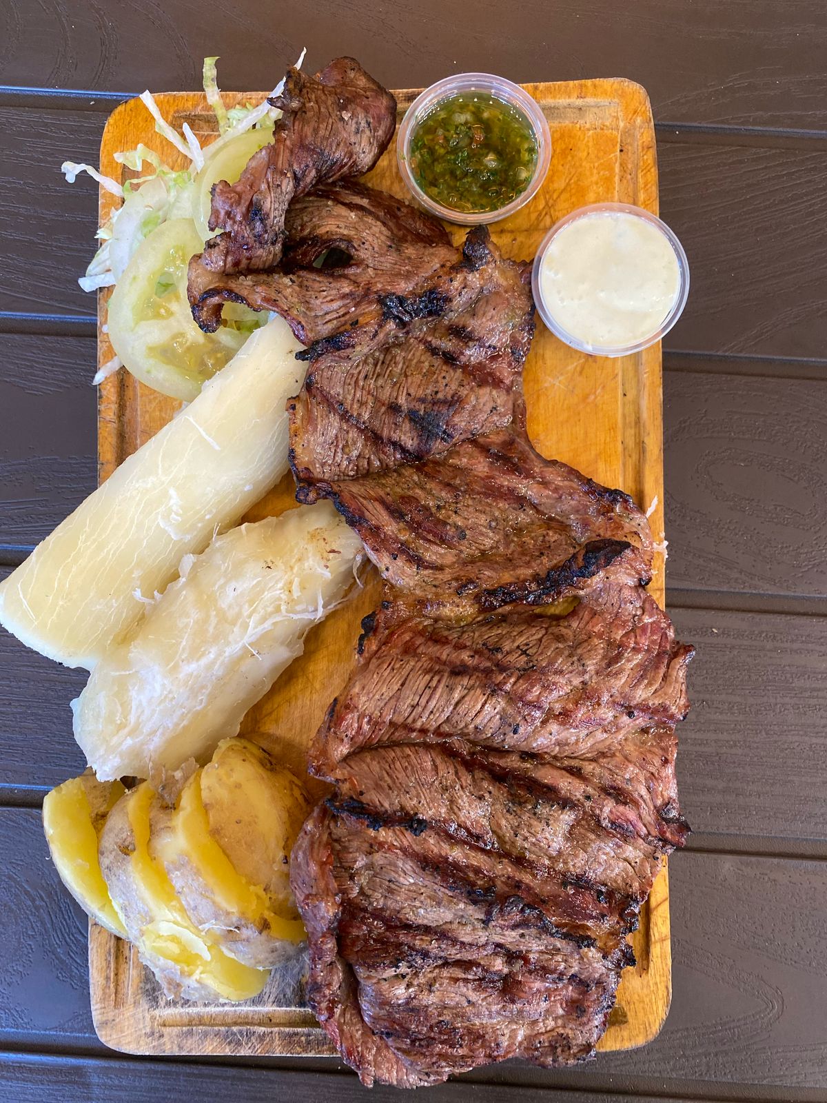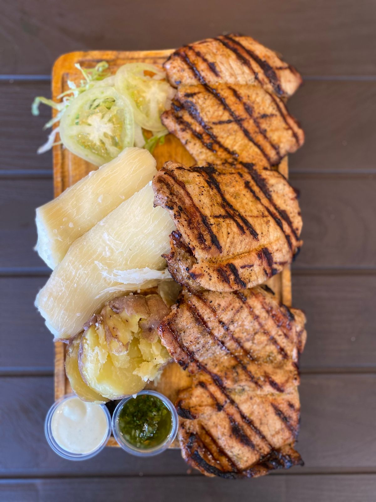 Churrasco de cerdo 300 g, acompañado de bollo, maduro con queso y mazorca asada.