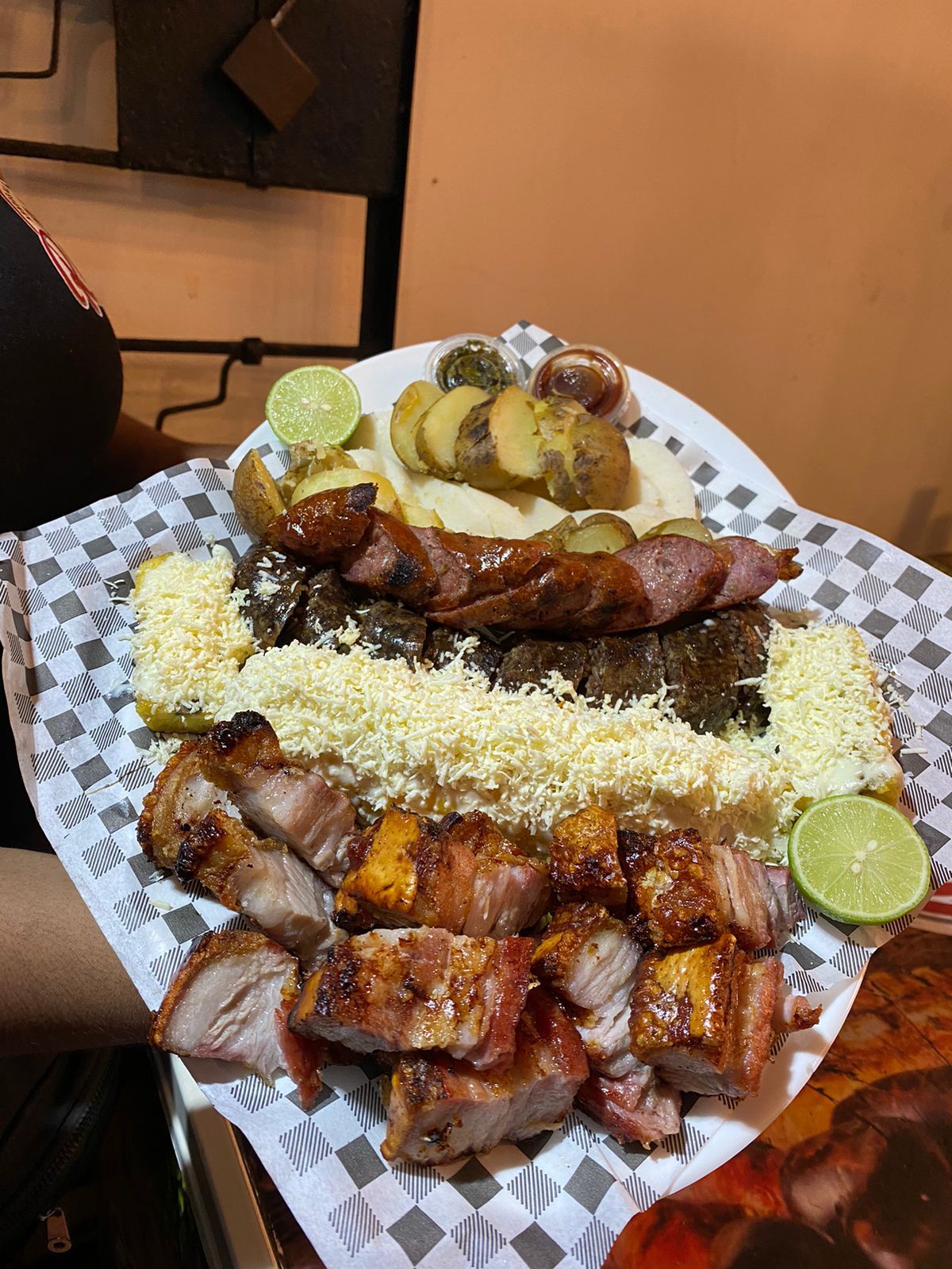 Chicharrón, morcilla, chorizo de cerdo, maduro, bollo, papa, mazorca asada.