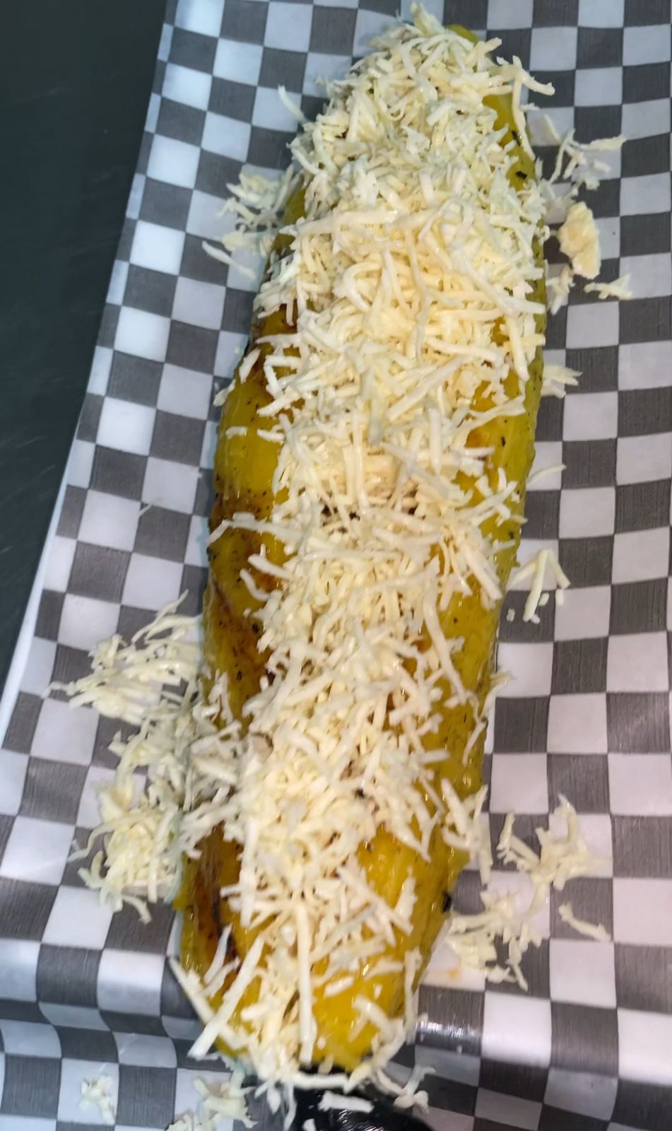 Punta gorda 300 g, acompañado de bollo, maduro con queso y mazorca asada.