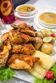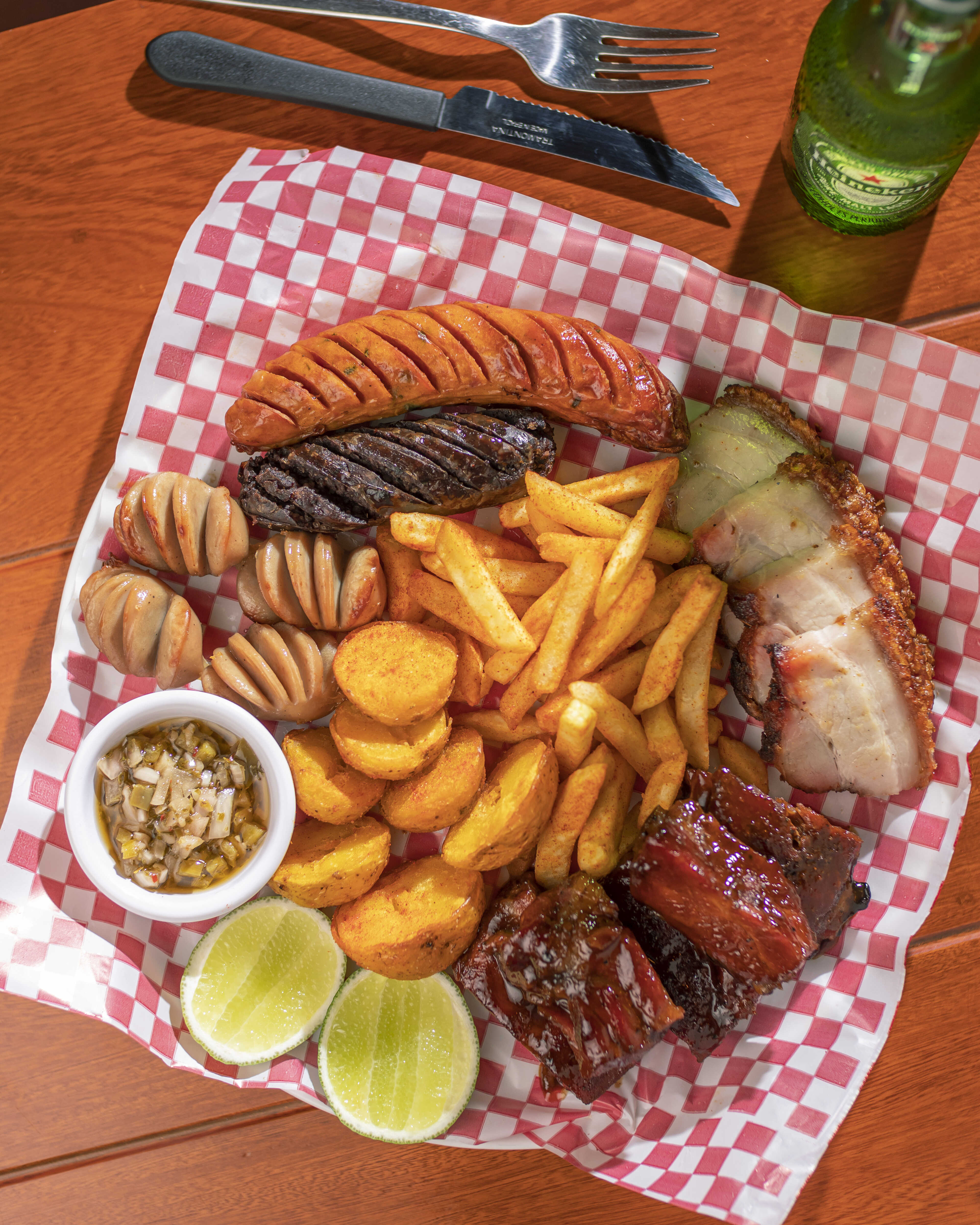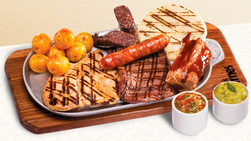 Carne, pechuga, lomo cerdo, chorizo, acompañado de papa cocida, yuca, salsa de ajo y guacamole.