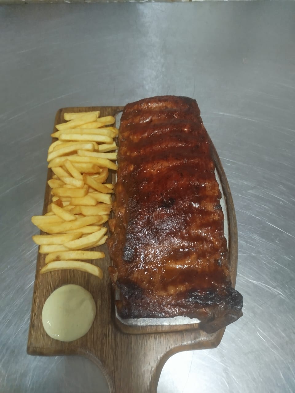 Costilla BBQ acompañado de papa a la francesa y ensalada.