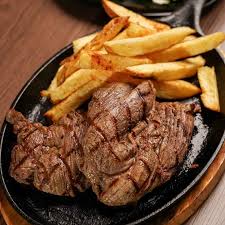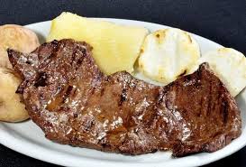 Carne asada 350 g acompañado de papa cocida, yuca y salsa de ajo.