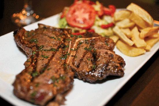 Churrasco 350 g acompañado de papa cocida, yuca y salsa de ajo.
