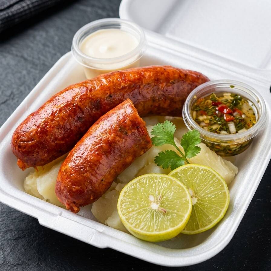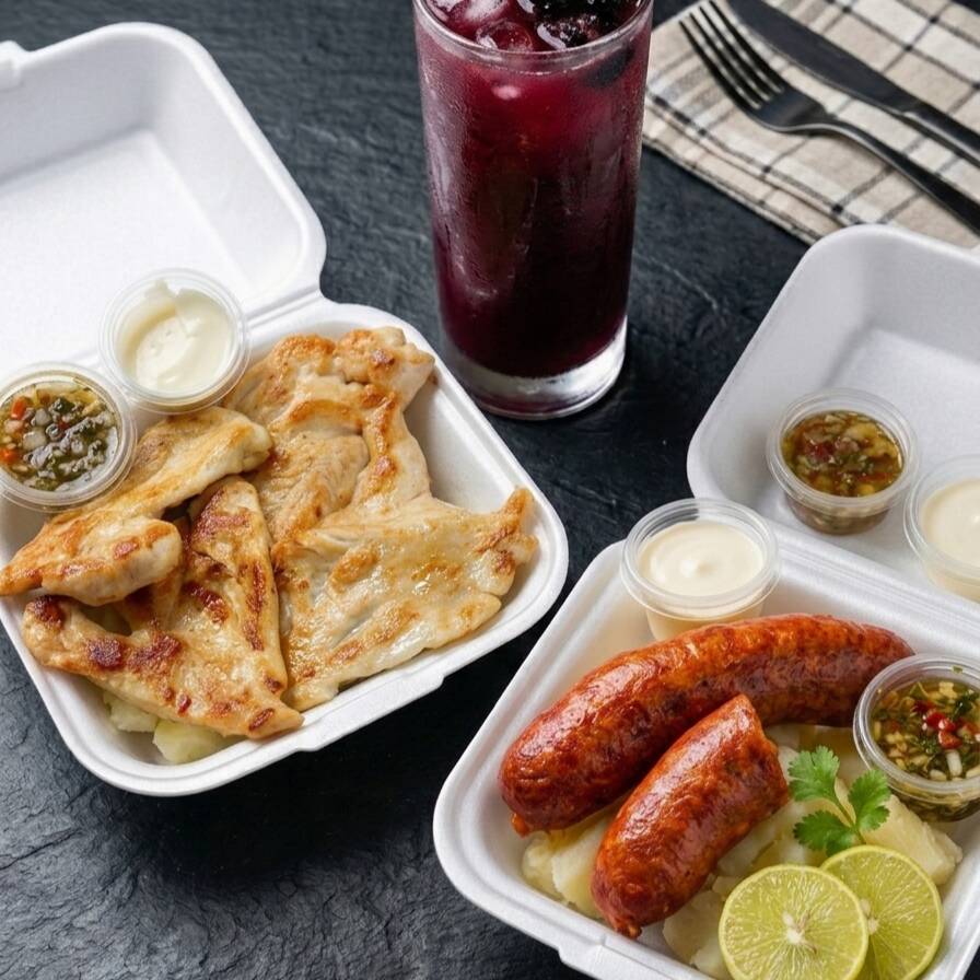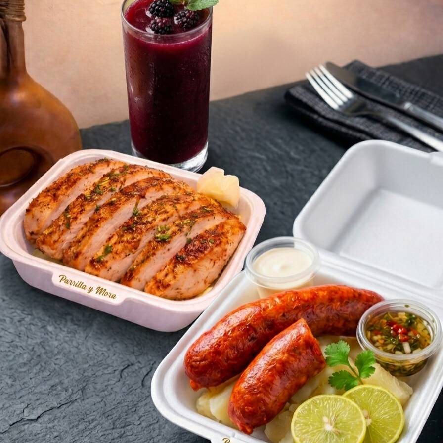 1 Libra Y media de pechuga+ 2chorizos acompañado de yuca o papa al vapor salsa de ajo de la casa + chimichurri obesquido 3 jugos de mora naturales
