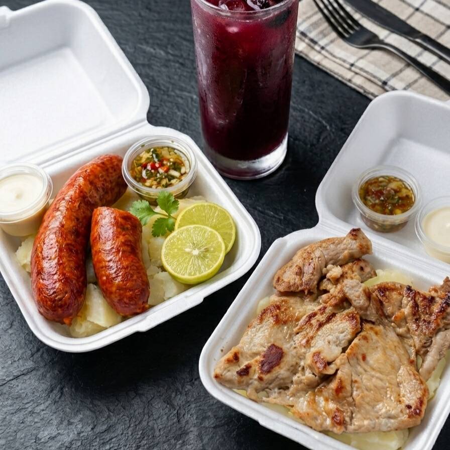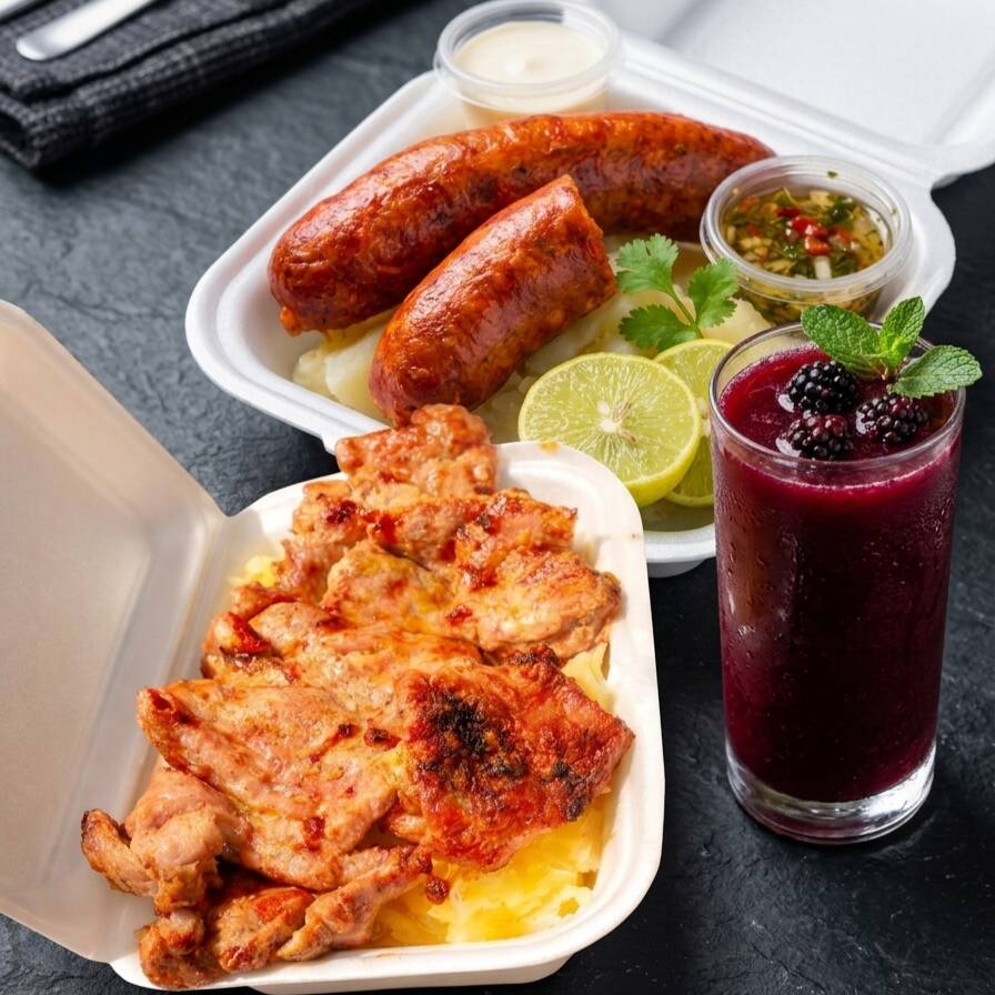 1 Libra Y media de bondiola+ 2chorizos acompañado de yuca o papa al vapor salsa de ajo de la casa + chimichurri obesquido 3 jugos de mora naturales