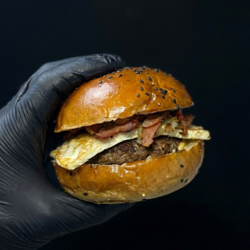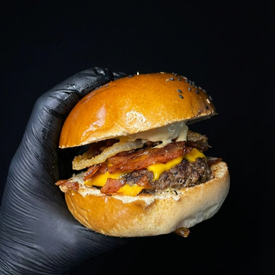 Para un rugido de sabor: 150 g de carne premium, pan brioche, mermelada de tocino, queso cheddar, aros de cebolla crujientes y salsa astral. Incluye papas.