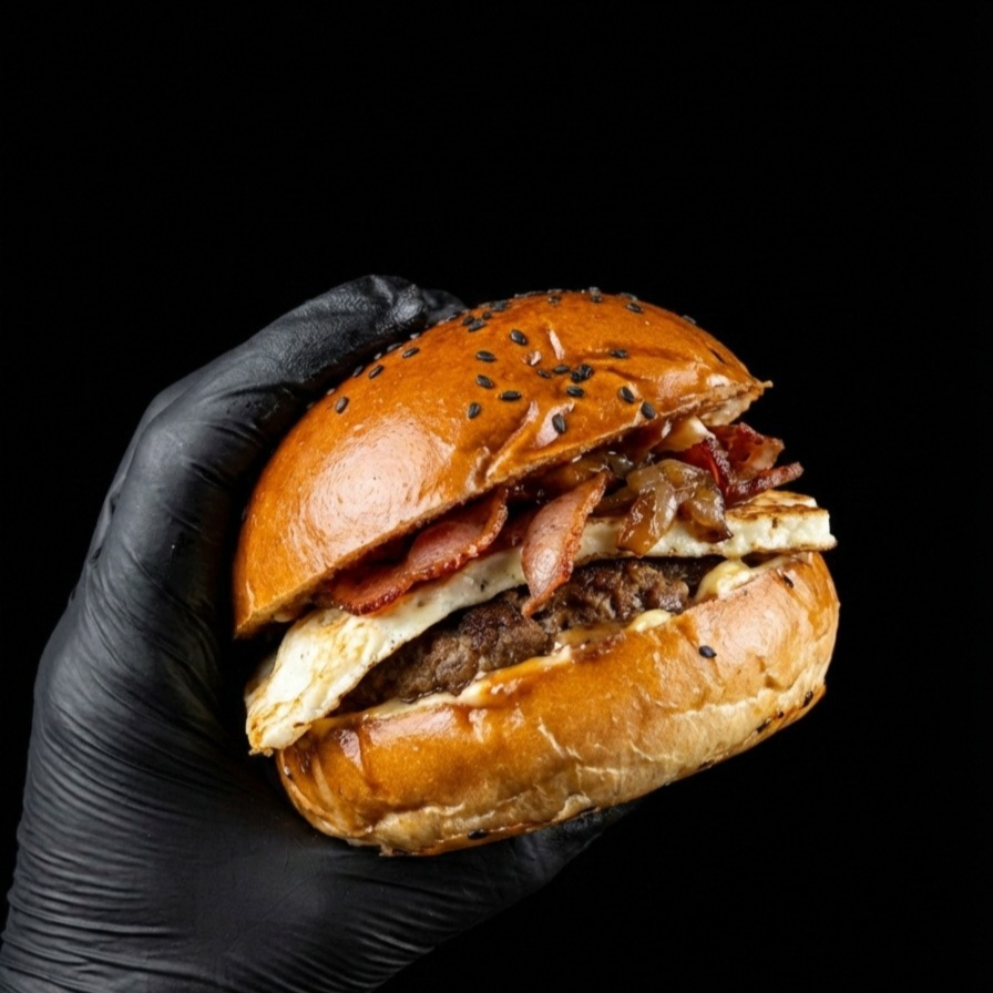 Sabor local galáctico: 150 g de carne premium, pan brioche, queso costeño asado, tocineta en trozos, cebolla caramelizada y salsa astral. Incluye papas.