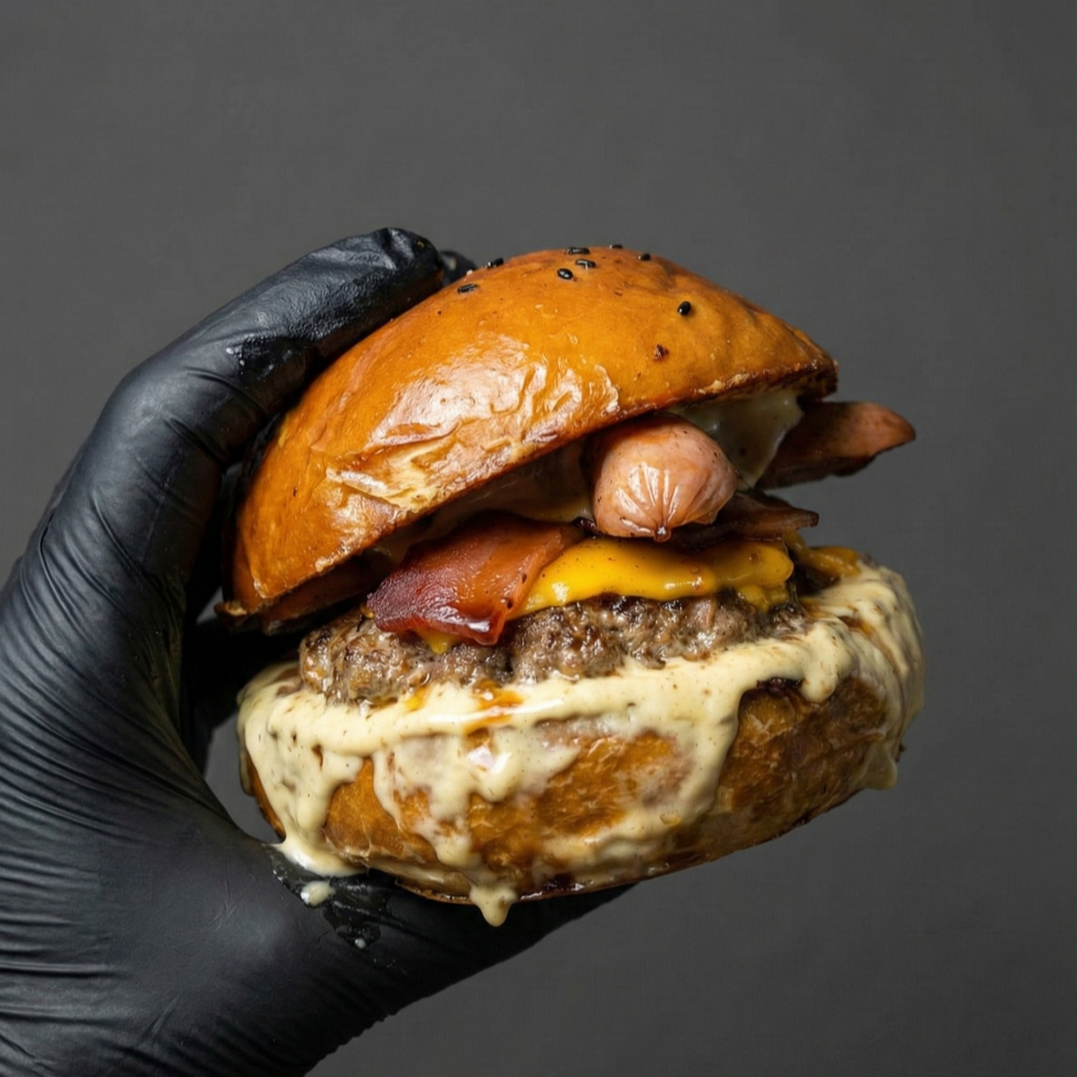 Doble órbita de sabor: dos carnes de 120 g de carne premium (240 g totales), pan brioche, queso cheddar, tocineta, pepinillos y salsa astral. Incluye papas, más 1.