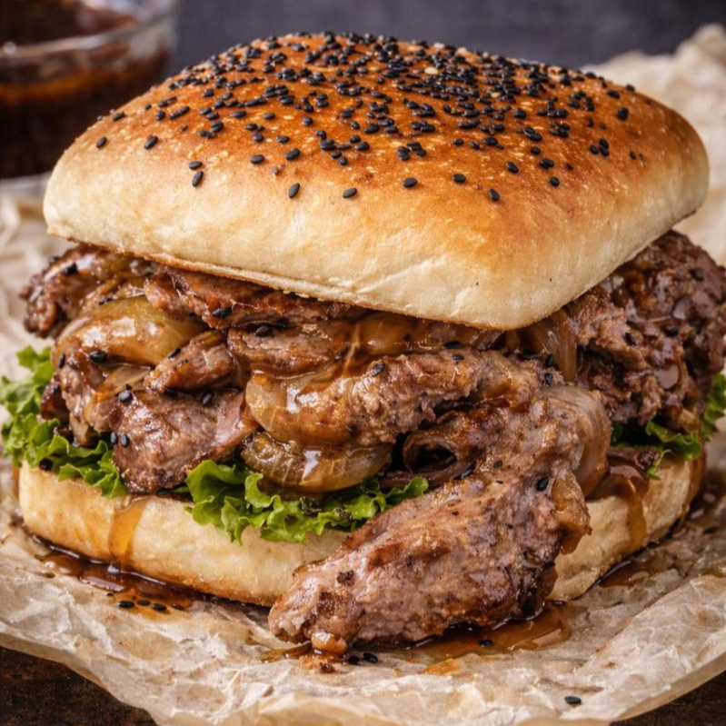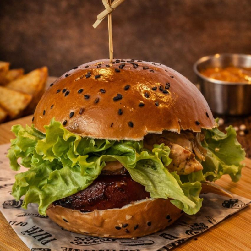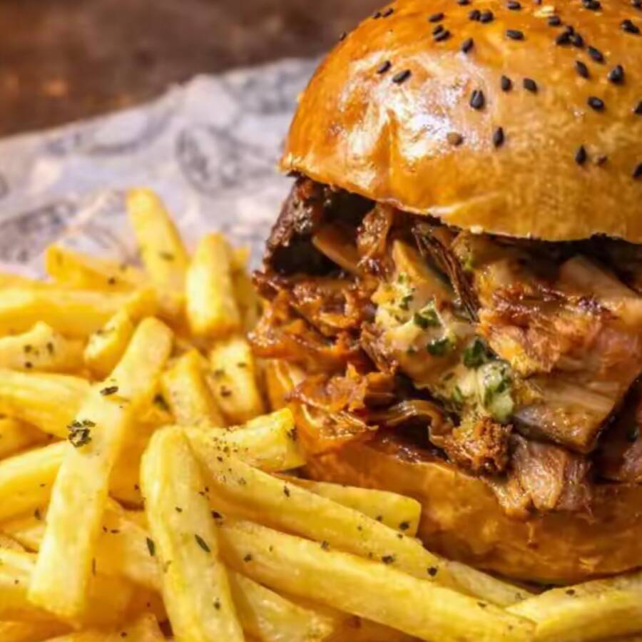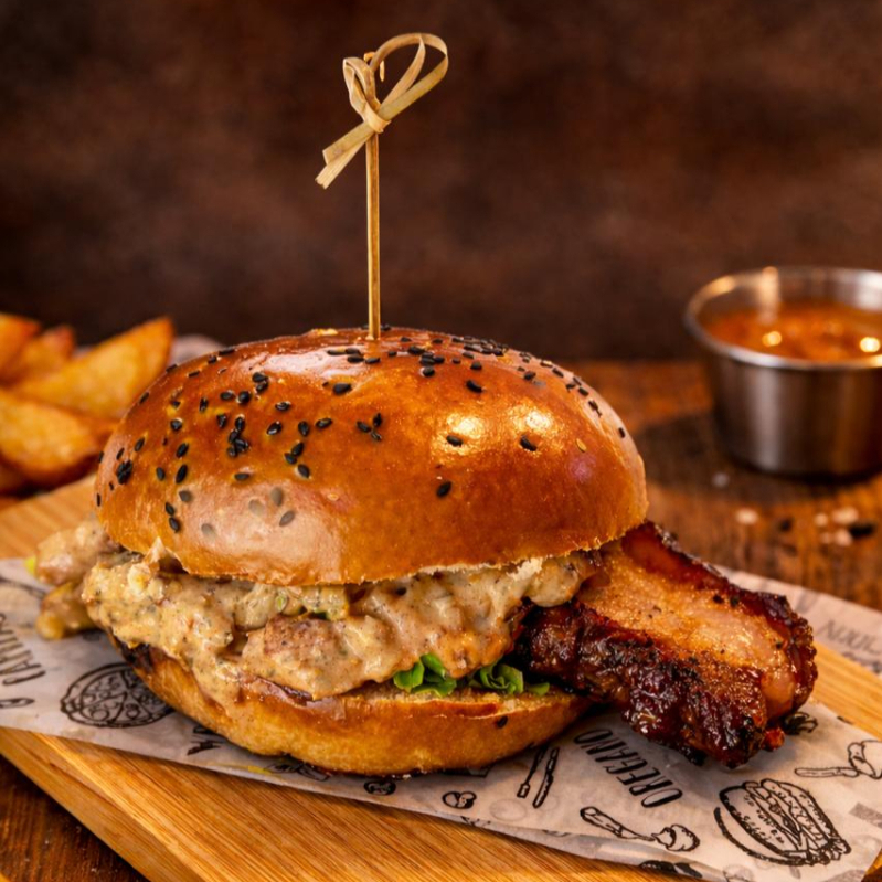 Panceta bacon dorada, cebolla caramelizada, salsa de la casa en pan artesanal de finas hierbas o sésamo