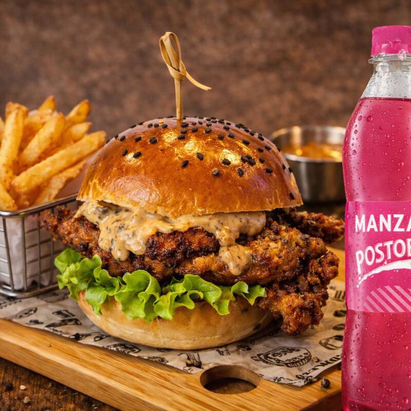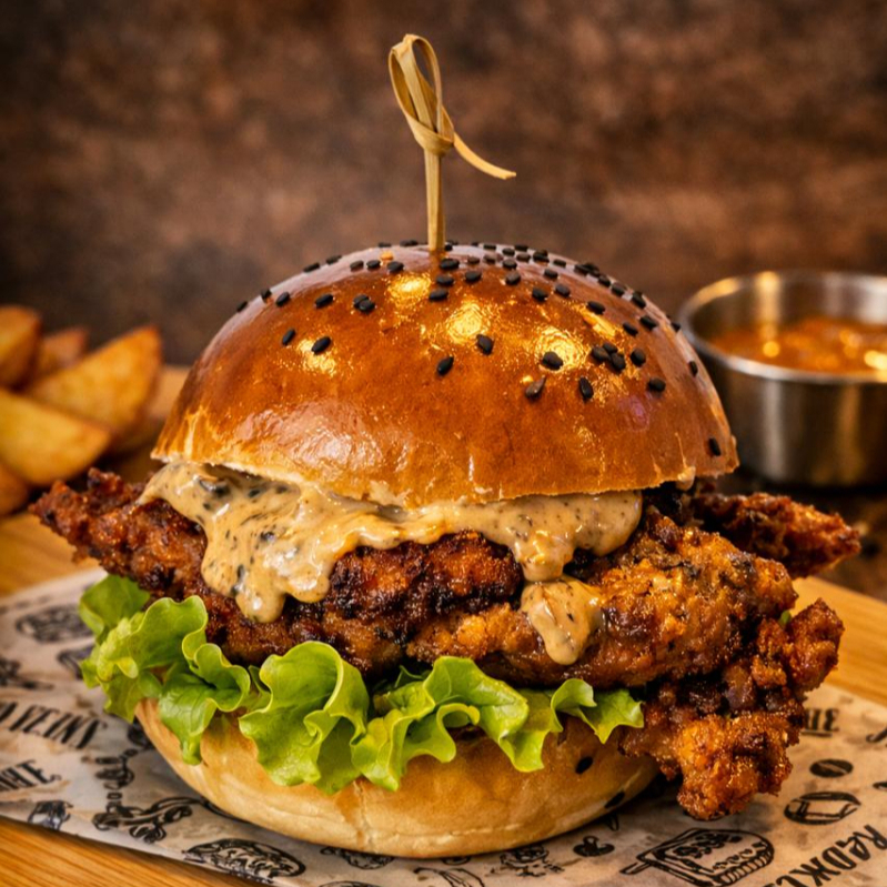 Crujiente pollo al estilo alemán, cebolla caramelizada, salsa de la casa en pan artesanal de finas hierbas o sésamo