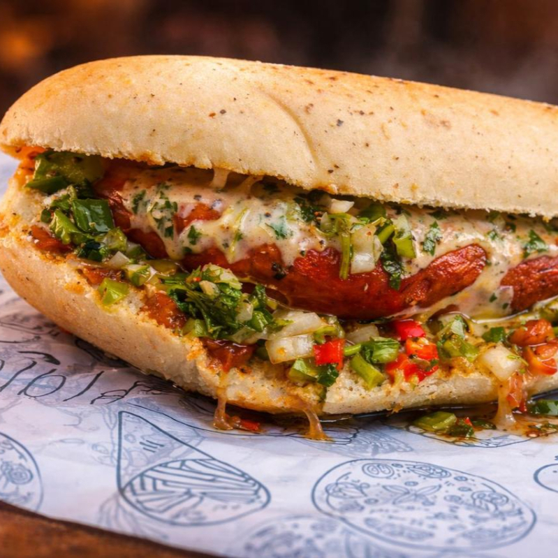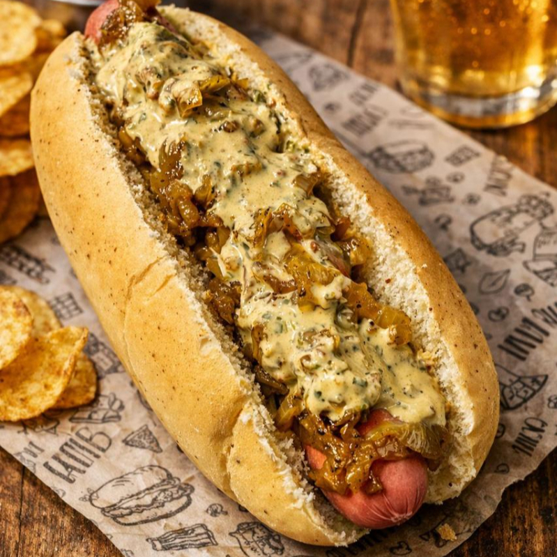 Clásica salchicha alemana, pan de finas hierbas con cebolla caramelizada y tu elección de salsa de la casa o mostaza