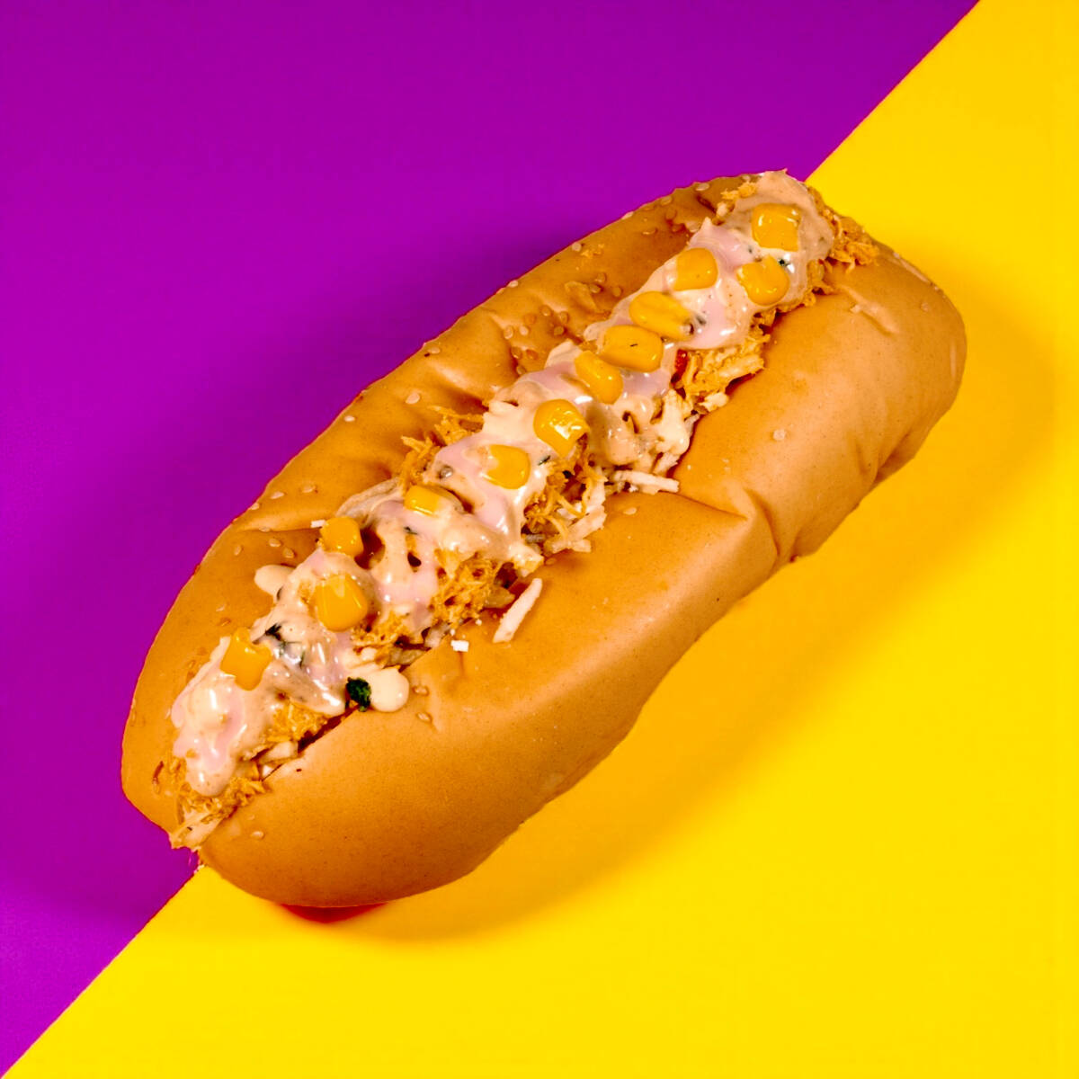 Pan especial de mantequilla, salchicha, pollo desmenuzado, queso costeño, chongo, maíz tierno, lechuga y salsas de la casa