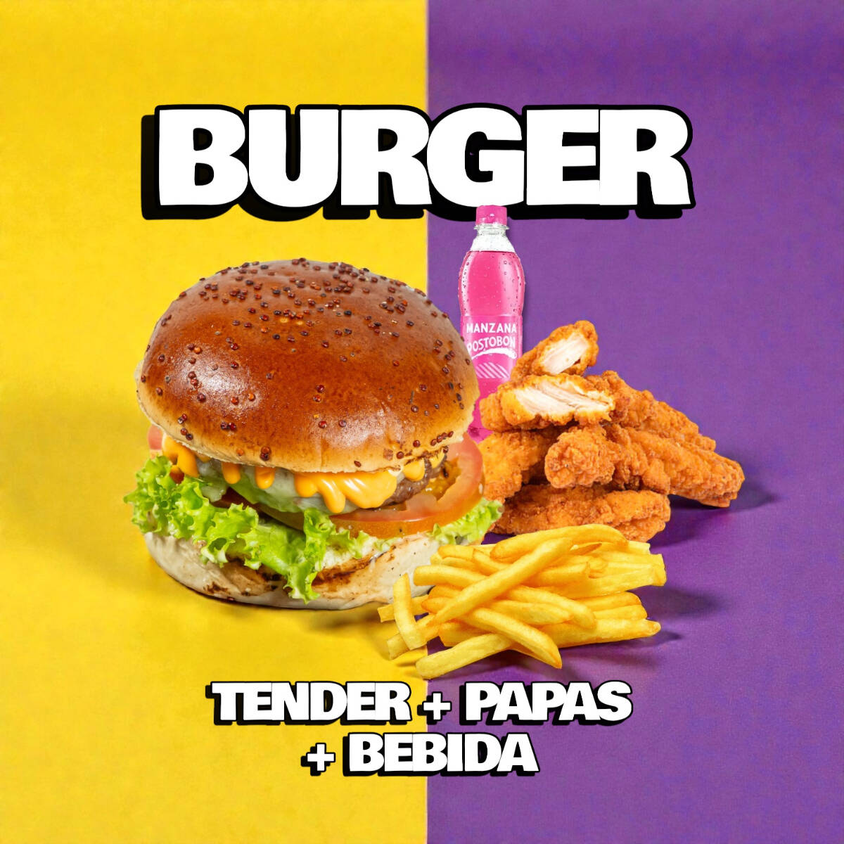 Super combo hamburguesa clásica médium, pollo tender, papas fritas y gaseosas 250 ml (Sabor según disponibilidad).