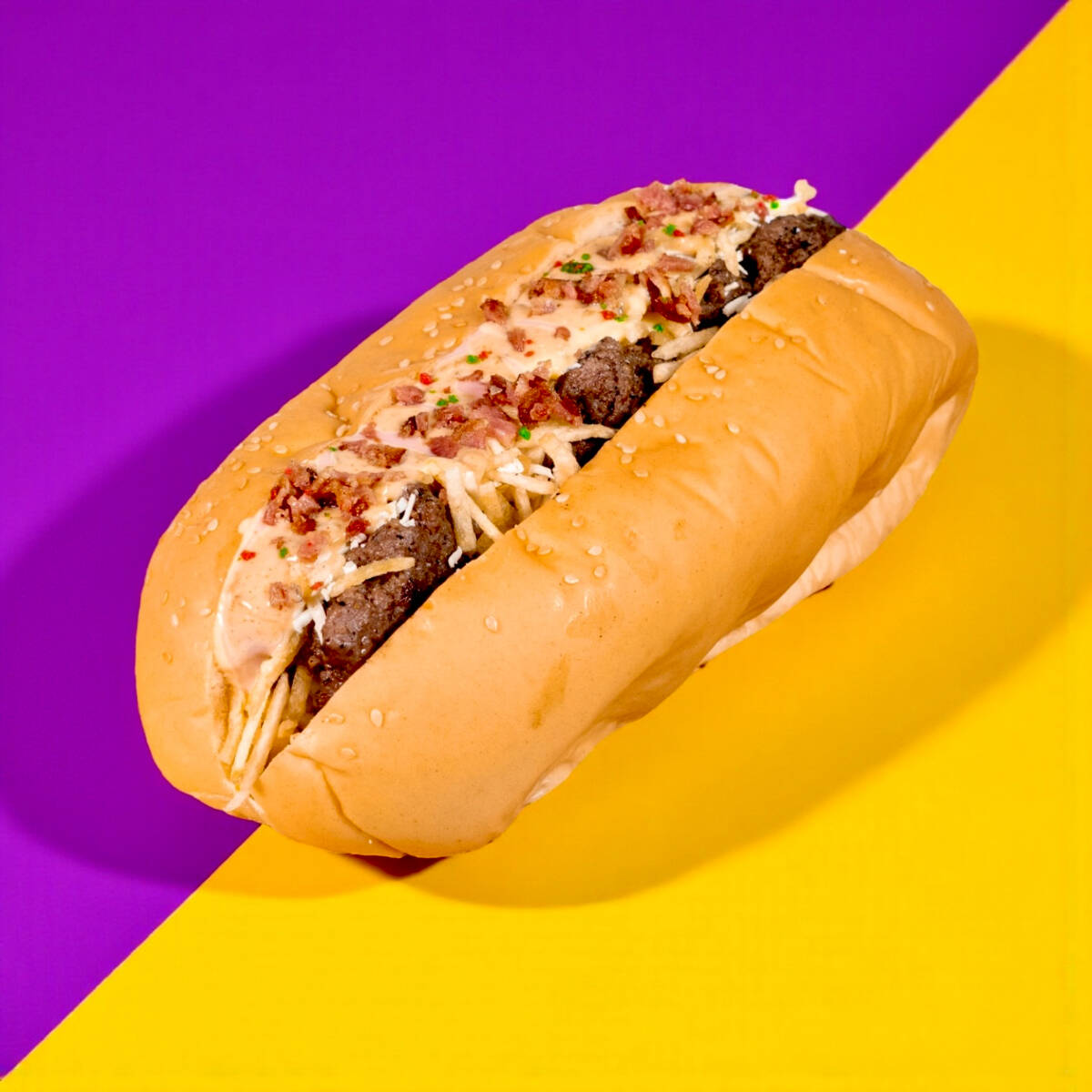 Pan especial de mantequilla, salchicha, carne de hamburguesa, cebolla caramelizada, queso mozzarella, chongo, lechuga y salsas de la casa